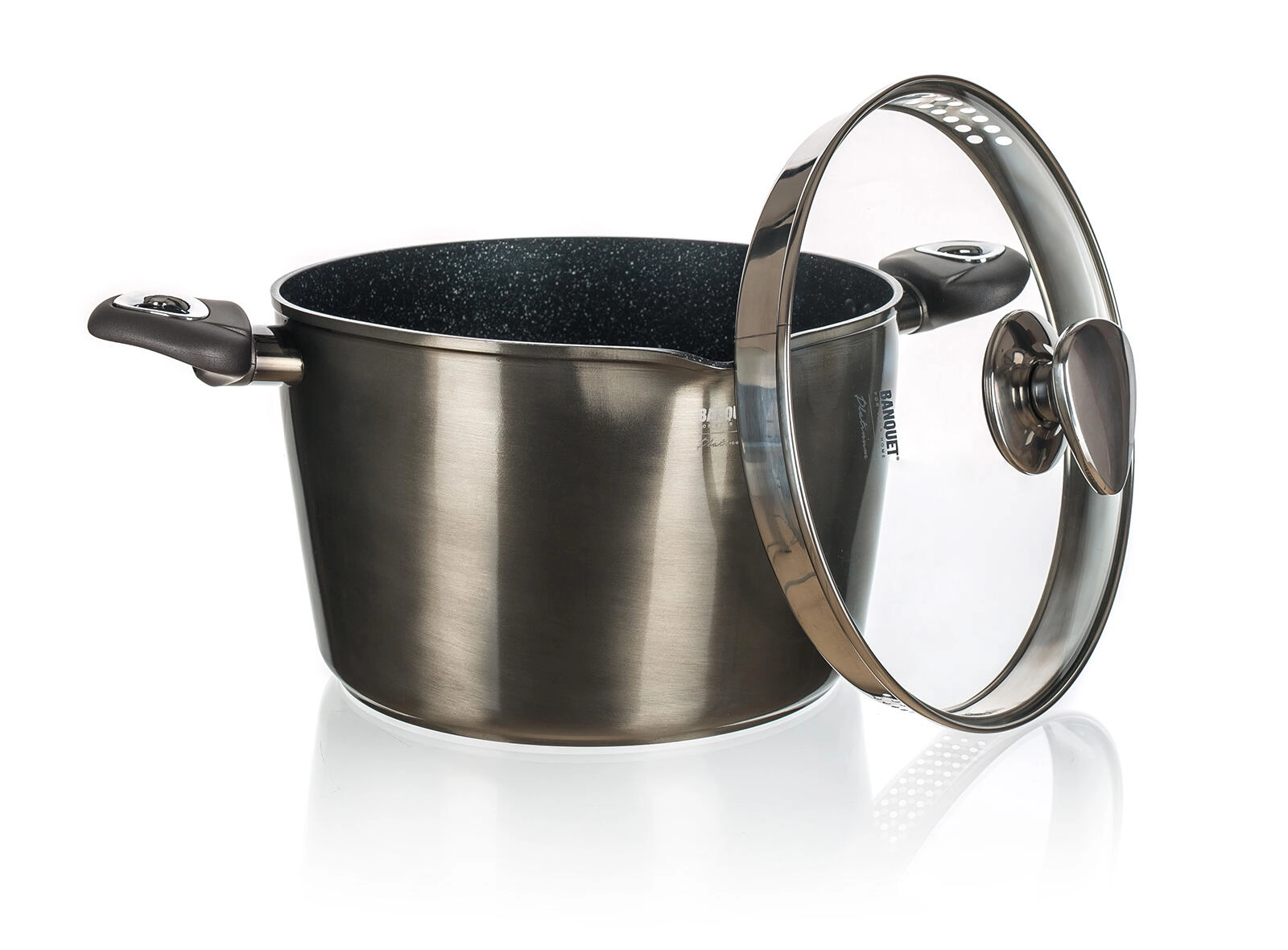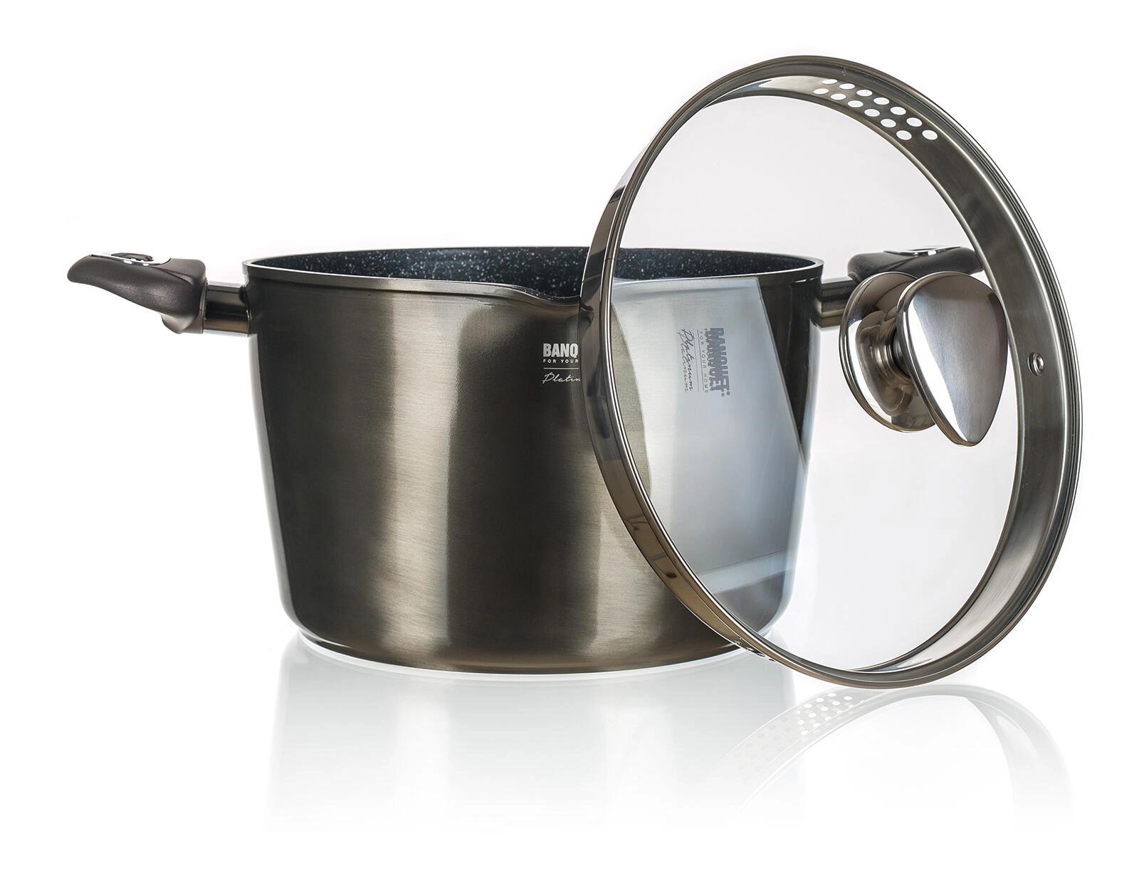 Az üvegfedő steam vent gőznyílással és (kivitel függvényében) integrált szűrőnyílásokkal a peremen kényelmes leöntést és az ételek ellenőrzését biztosítja. A praktikus kiöntőcsőr emellett megkönnyíti a pontos, cseppmentes adagolást. Az eleganciát a karbon‑metál külső bevonat és az ergonomikus soft‑touch fogantyúk emelik ki.