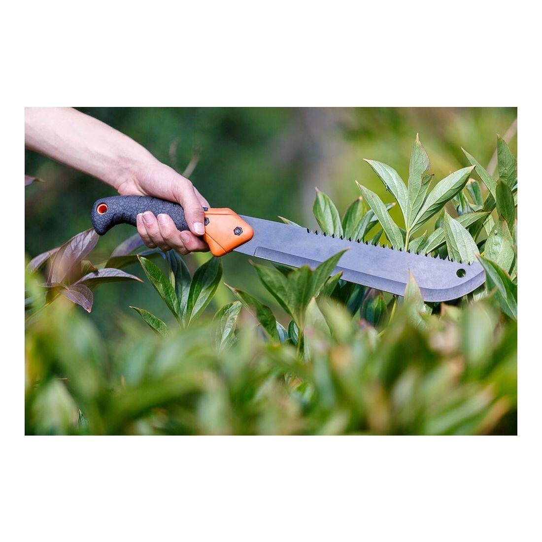 Vágja le az erős ágakat az éles éllel, és fűrészelje a keményebb fát a penge hátán lévő fogazott fűrésszel – gyorsabb munka szerszámcsere nélkül.