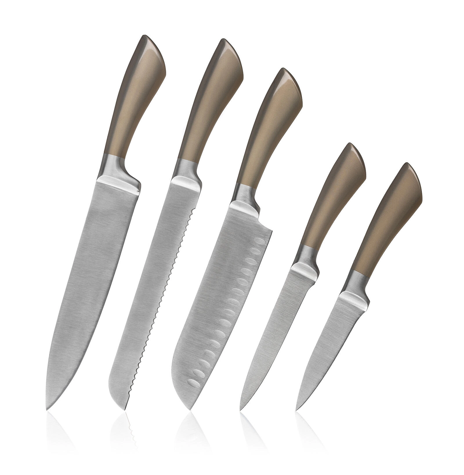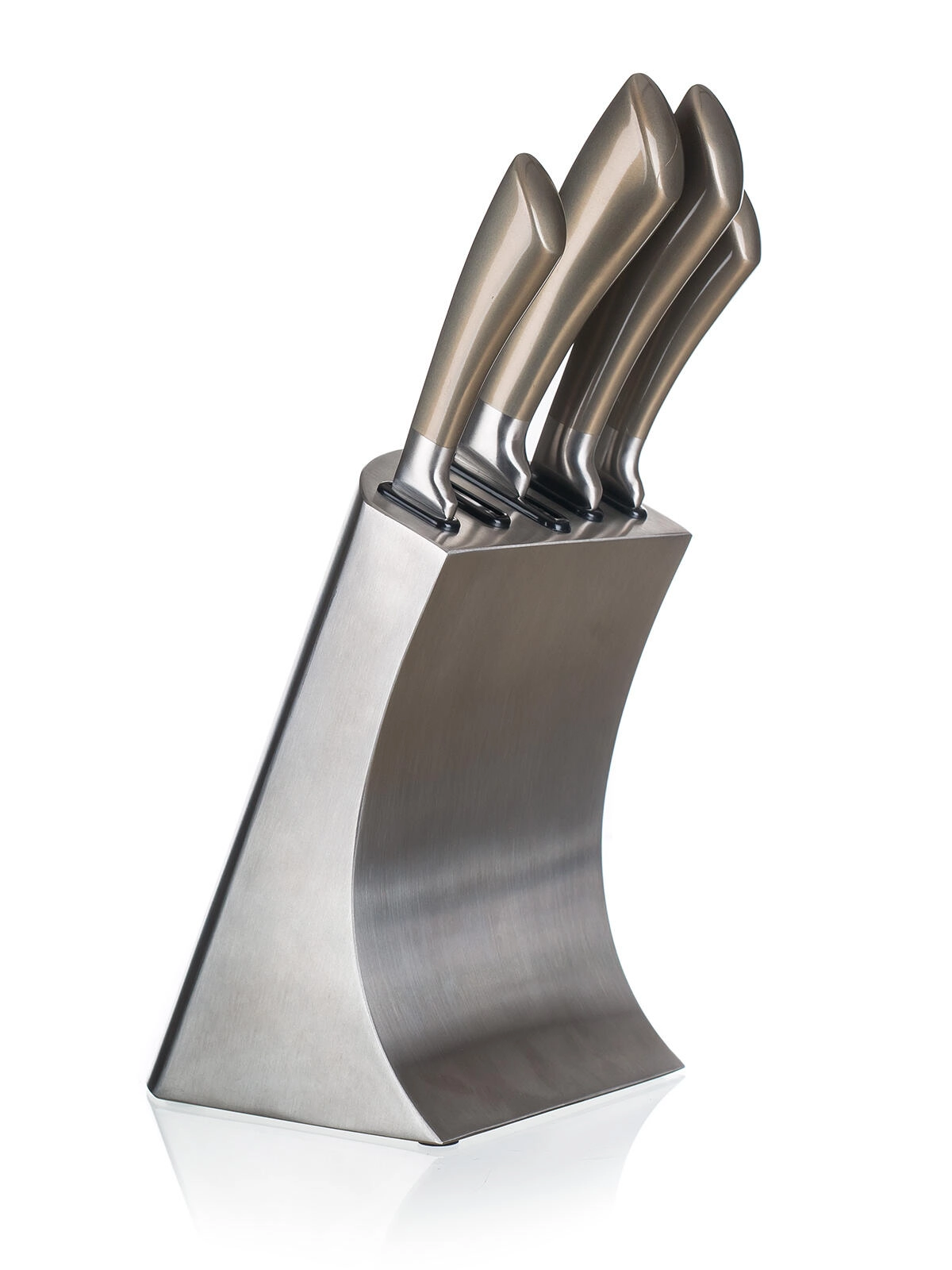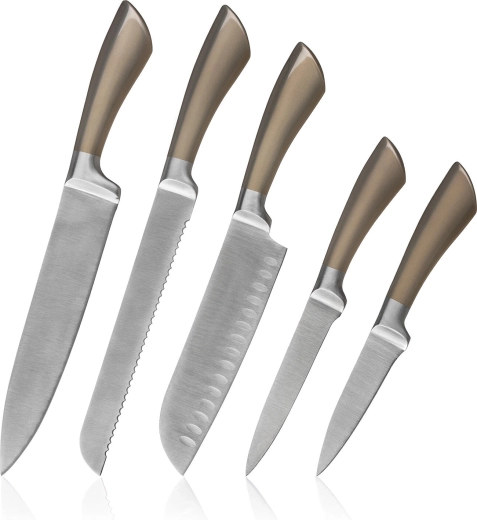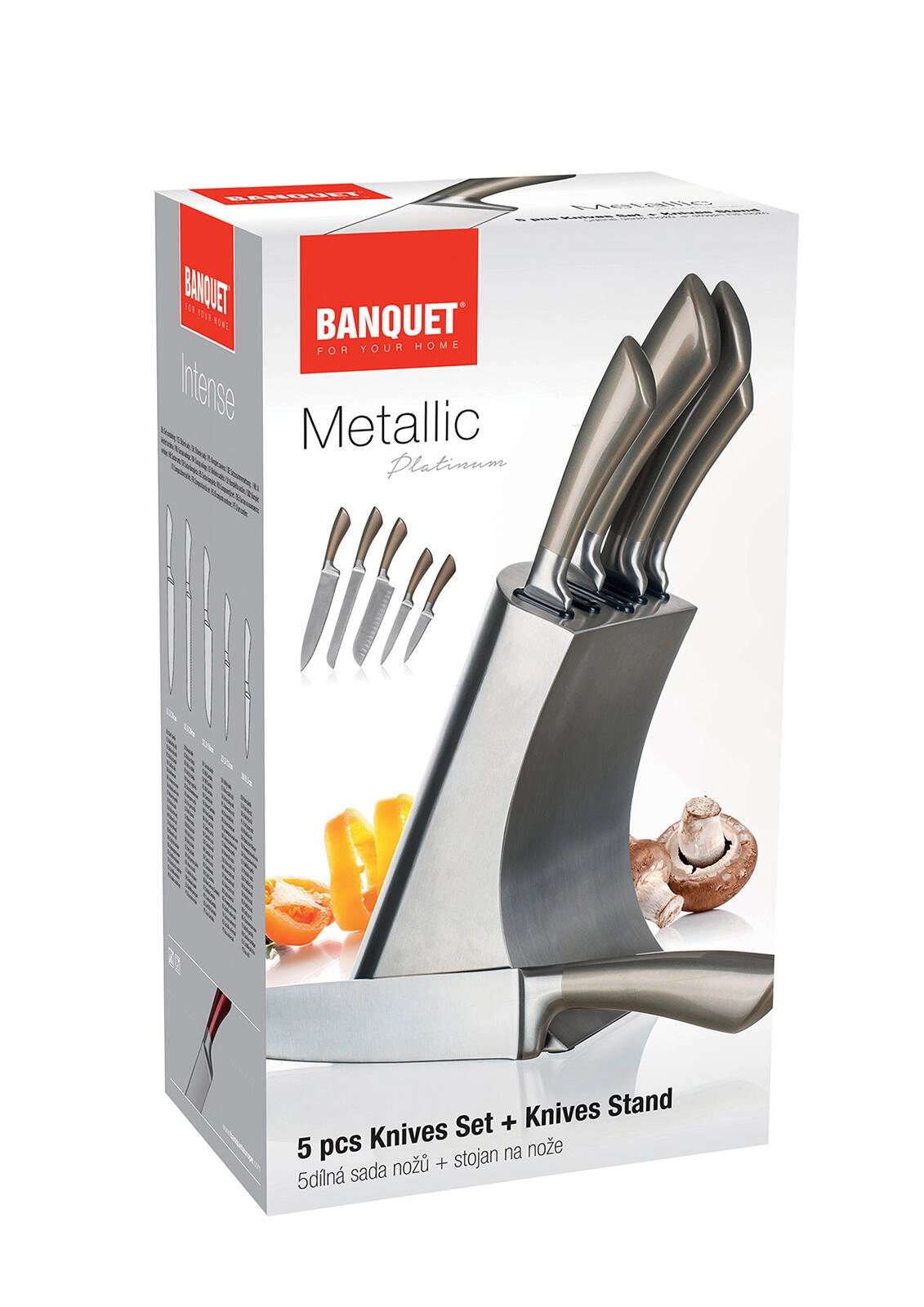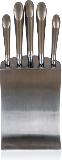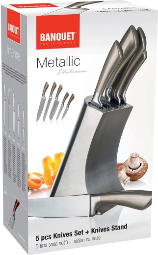 A METALLIC Platinum készlet a modern megjelenést funkcionalitással ötvözi. A rozsdamentes acél kések megbízható élességet és könnyű karbantartást kínálnak, míg a stabil fém állvány biztonságban és kéznél tartja a pengéket. Tökéletes választás minden konyhába, ahol a teljesítmény és a dizájn egyaránt fontos.