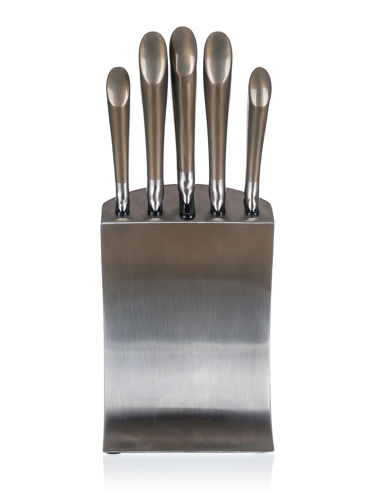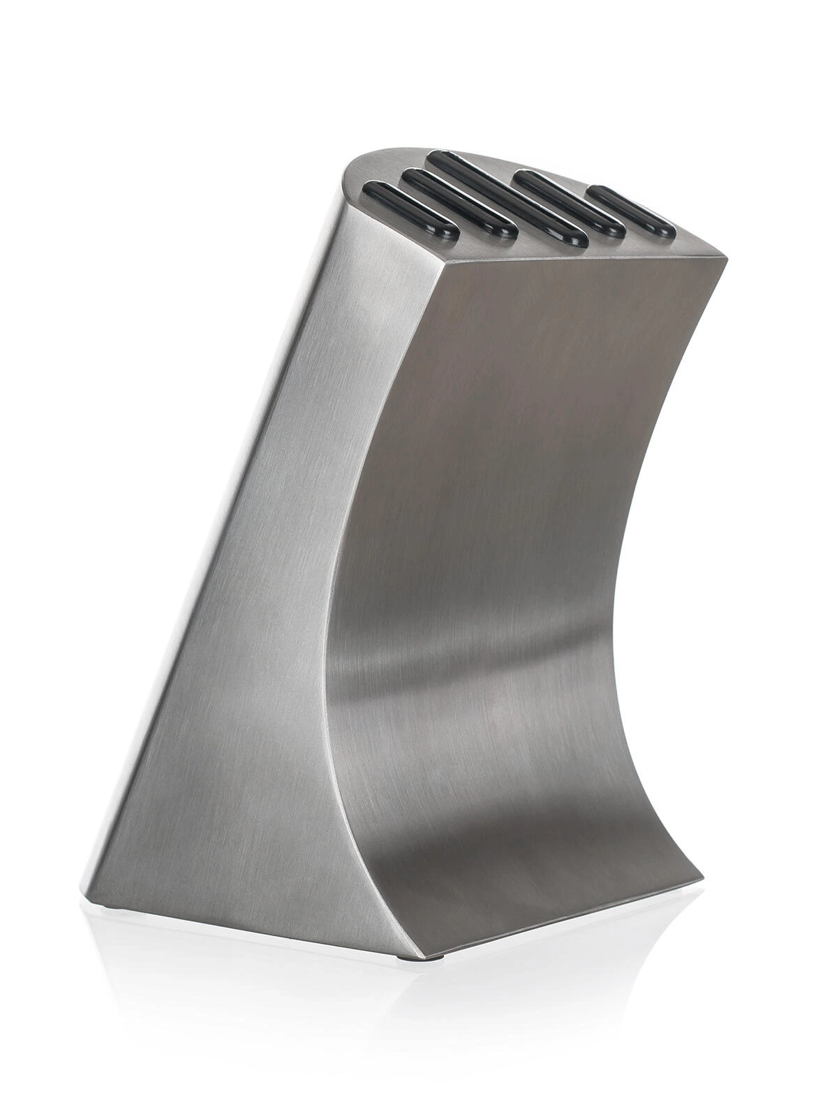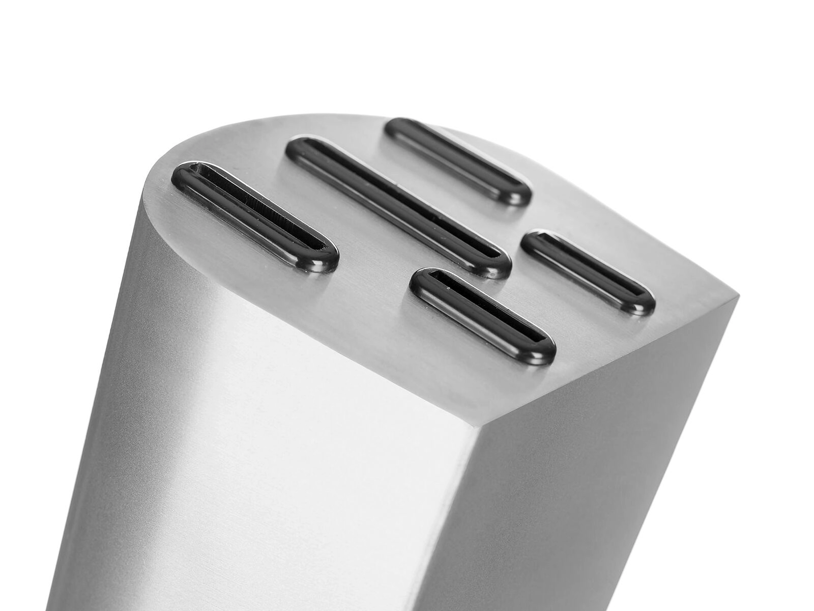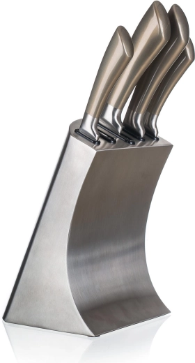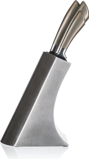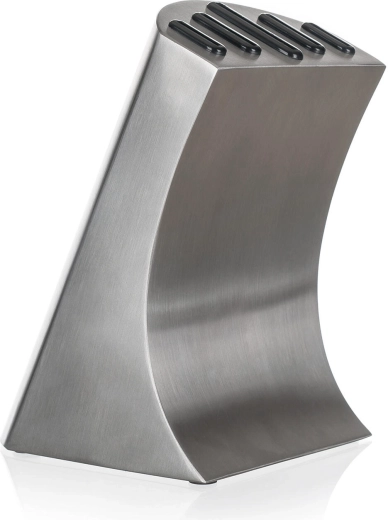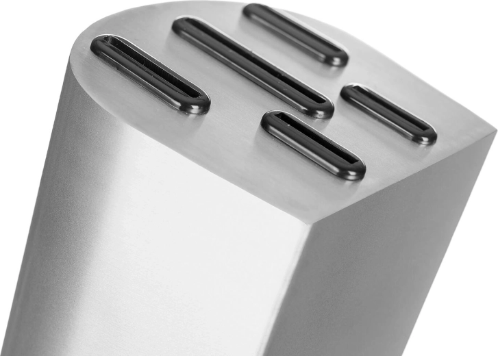 Az elegáns fém blokk csúszásmentes talppal rendezetten tartja az összes kést, védi az éleket, és gyors hozzáférést biztosít főzés közben.