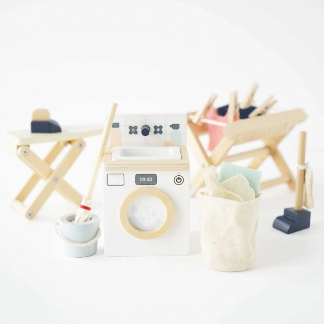 Változtasd a gyerekek mosási játékát igazi szórakozássá ezzel a gyönyörű mosókonyha szettel a Le Toy Van-tól. A 16 részes, FSC tanúsított fából készült készlet tartalmaz mosógépet, szárítóállványt, vasalót vasalódeszkával, csipeszeket, filc ruhácskákat, seprűt vödörrel, porszívót és további kiegészítőket. A játék kézzel utófestett, környezetbarát festékkel készült, biztonságos a gyermekek számára, és tökéletesen illik a Le Toy Van Daisylane kollekció babaházaihoz.