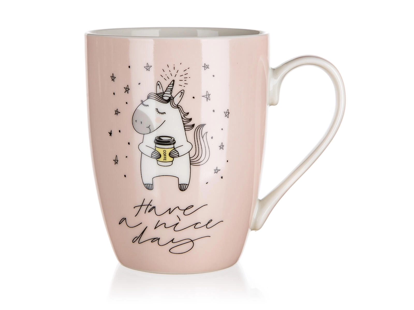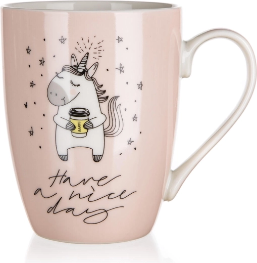 A bögre két dizájnban érhető el – „I believe in unicorns” és „Have a nice day” feliratokkal. Felső átmérő kb. 8 cm, alsó átmérő kb. 5,5 cm. Egyszerű mosogatógépes tisztítása és mikrohullámú melegítési lehetősége miatt praktikus kiegészítő minden konyhába.