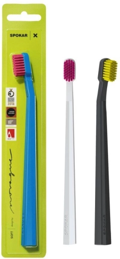 A SPOKAR X sorozat ultrapuha fogkeféje a fogorvosok aktuális ajánlásai alapján készült. Egyedi dizájnja támogatja az optimális fogást, megkönnyíti a kezelhetőséget, és segít tökéletesen tiszta fogakat elérni az íny irritálása nélkül. A nagyon sűrű fej finom, lekerekített szálaival hatékonyan távolítja el a lepedéket a nehezen hozzáférhető helyekről is.