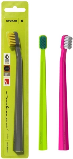 A Spokar X Soft fogkefét a fogorvosok aktuális ajánlásai alapján fejlesztették. Egyedülálló nyélformája támogatja a természetes, biztos fogást, amely megkönnyíti a kezelhetőséget és a fogfelszínek precíz tisztítását. A nagyon sűrűn ültetett fej lekerekített végű, puha sörtékkel kíméletesen ápolja az ínyt, miközben hatékonyan eltávolítja a lepedéket.