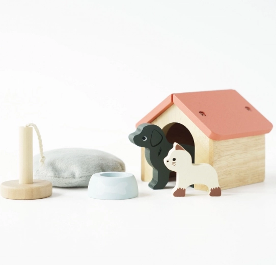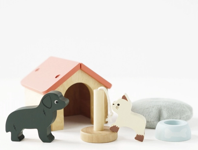 Bővítse a gyerekek fantáziavilágát a bájos fa kedvencek szettjével – kutyussal és cicával, házikóval és kiegészítőkkel. Ez a minőségi kiegészítő babaházakhoz és játékszínterekhez támogatja a szociális játékot, a kommunikációt és a képzelőerőt. FSC faanyagból készült, kézzel részletfestett vízbázisú, nem mérgező festékekkel, és úgy tervezték, hogy hosszú élettartamú legyen.