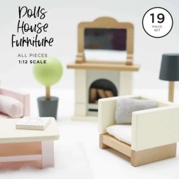 A készlet 19 részből áll: kanapé és fotel textil párnákkal, dohányzóasztal, kandalló fahasábokkal és tükörrel, szőnyeg, virág cserépben és lámpa. Méretben illeszkedik a Le Toy Van babaházaihoz. A Daisylane kollekció további kiegészítői elérhetők weboldalunkon.
