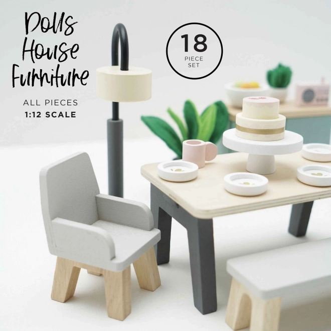 Tartalmaz egy asztalt, két széket, egy padot, egy lámpát és egy kredencet a babaházi étkező tökéletes szimulációjához.
