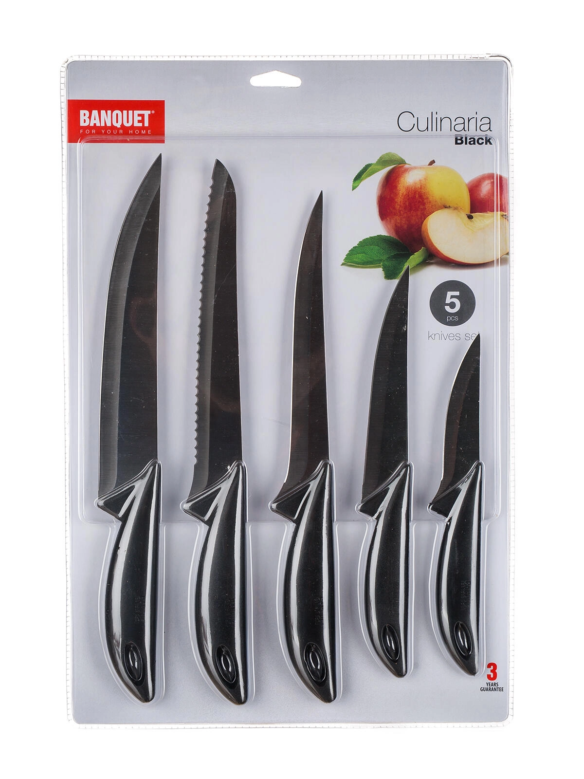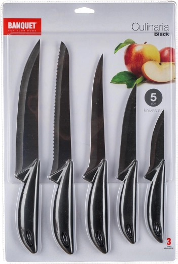Ezzel az univerzális Culinaria késkészlettel mindent megkap, amire szüksége van a reggelitől a vacsoráig tartó ételkészítéshez. Az acél pengék garantálják a hosszú élettartamot és a élességet, míg az ergonomikus fekete markolatok kényelmes és biztonságos fogást biztosítanak. Ideális választás bármely háztartási konyhába.