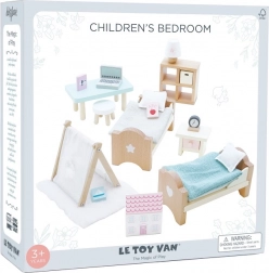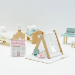 Ez a 24 darabos elegáns gyerekszoba szett babák számára ágyneművel és párnákkal ellátott ágyakat, éjjeliszekrényt lámpával, széket, szőnyeget és dekorációkat tartalmaz, amelyek valósághű megjelenést kölcsönöznek. A fából készült részletek és a finom pasztell színek eleganciát és stílust sugároznak. Etikusan fenntartható anyagokból készült és nem mérgező víz alapú festékekkel festett.