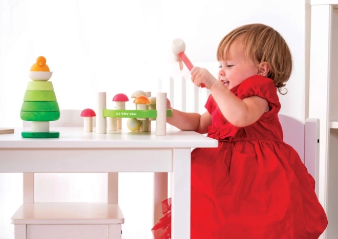 A játék fejleszti a motorikus képességeket azáltal, hogy a gyerekek a kalapáccsal kalapálják a gombákat. A színes minták és formák vizuális érzékelést is serkentik.