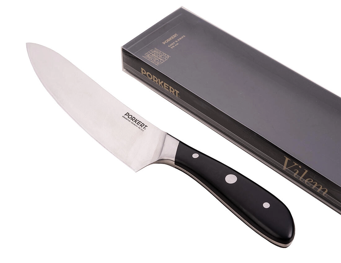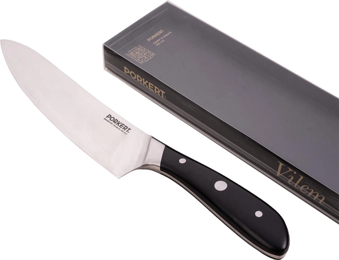 A Vilem szakácskés 20 cm-es pengehosszal univerzális választás minden konyhába. A minőségi X50CrMoV15 (ISO 1.4116) acél kiegyensúlyozott kombinációját biztosítja az élességnek, a korrózióállóságnak és a könnyű élezhetőségnek. Az ergonomikus, polírozott műanyag nyél biztos és kényelmes fogást ad még hosszan tartó munka közben is.