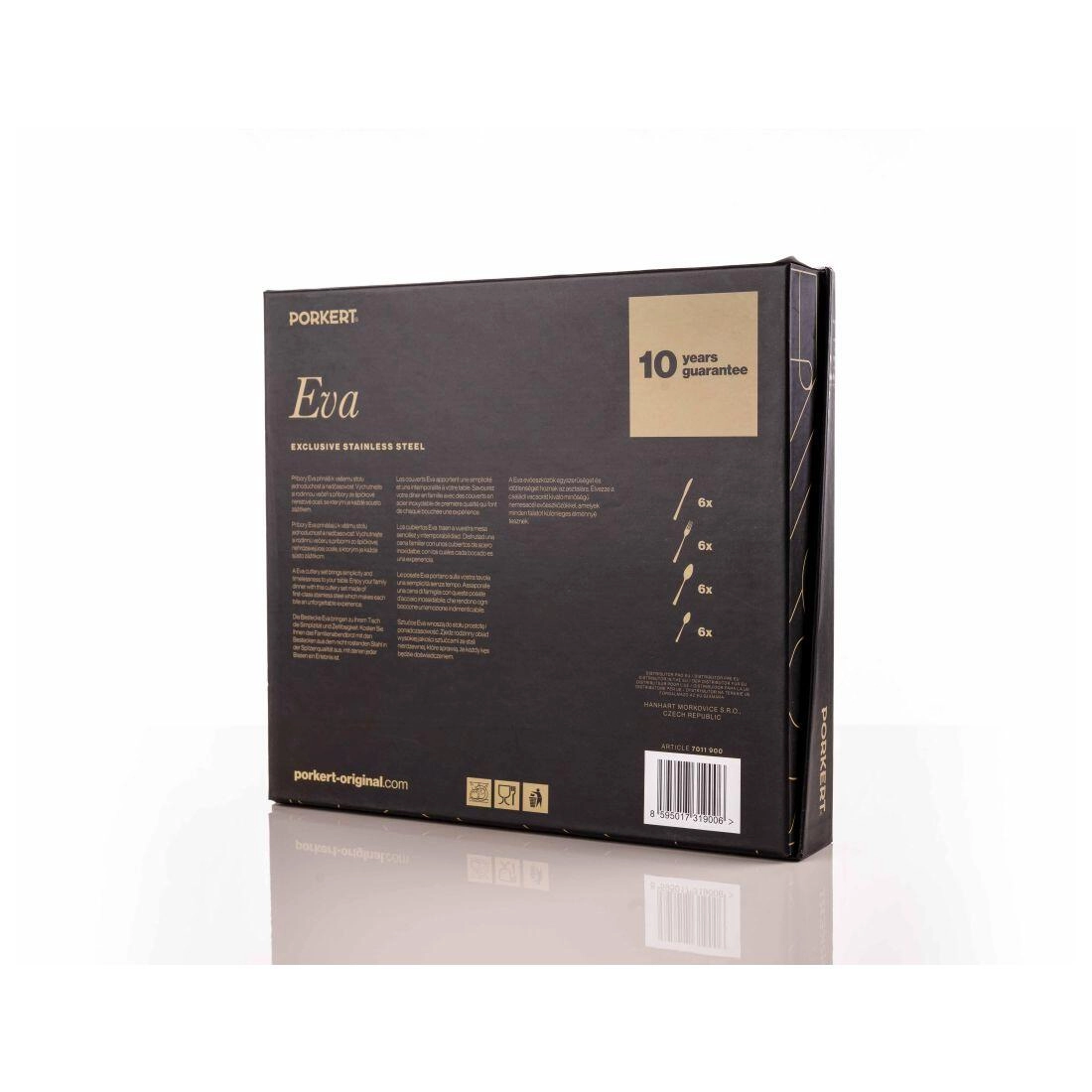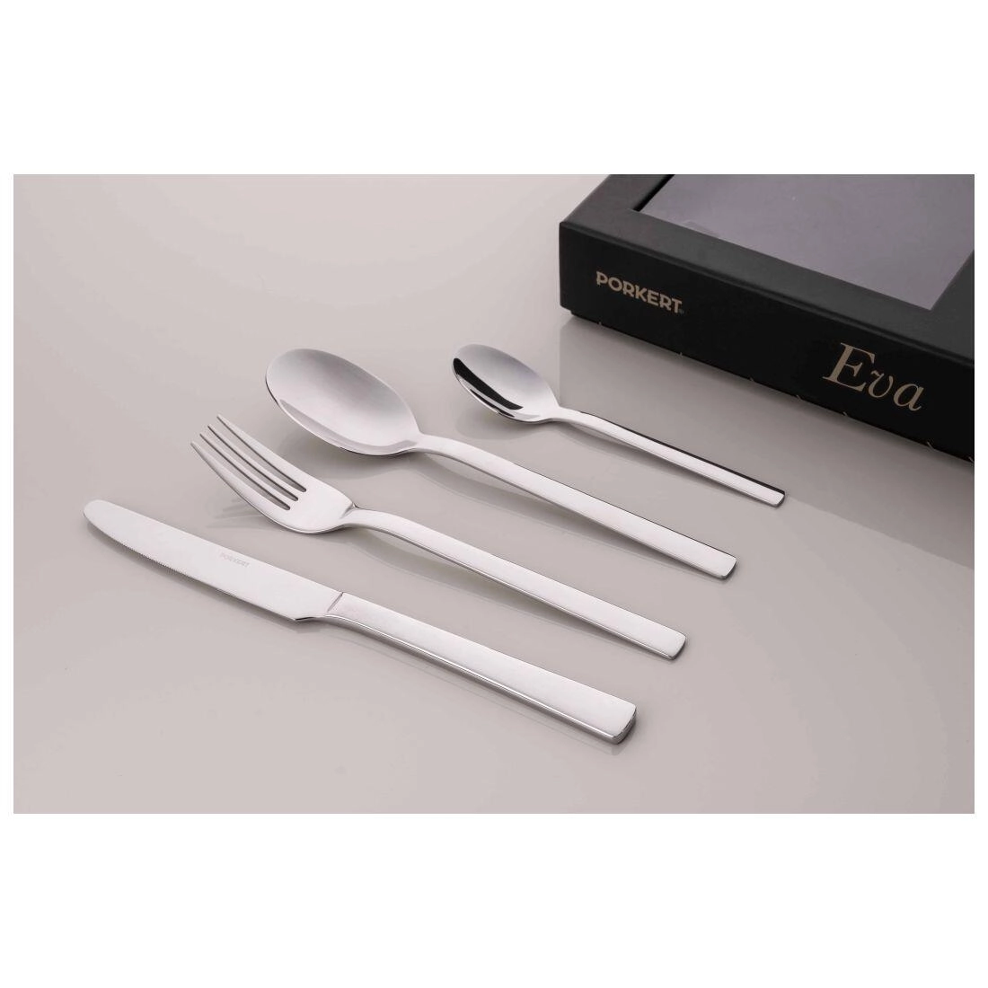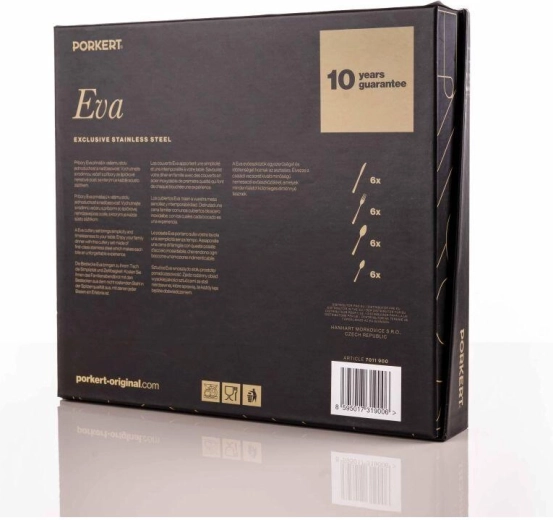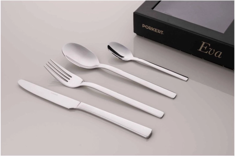 Az elegáns Eva evőeszközkészlet a letisztultságával és a tiszta dizájnnal tűnik ki. 24 darabból áll, kiváló minőségű rozsdamentes acélból – ideális családi étkezésekhez és mindennapi használatra.