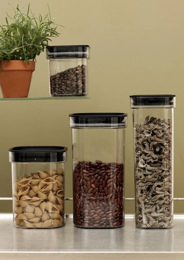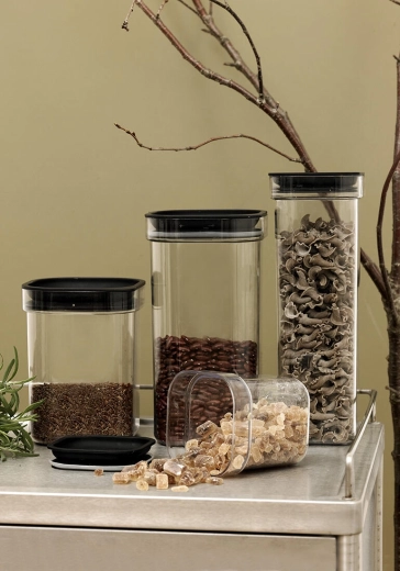 Az átlátszó testnek köszönhetően mindig pontosan látható a tartalom és a fennmaradó mennyiség. Az egyenes, fekete tető alkalmas a stócolásra, így könnyen rendet tarthat a polcon és a fiókban, miközben maximálisan kihasználja a rendelkezésre álló helyet.