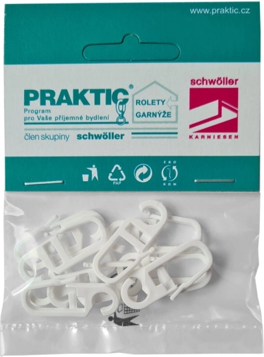 Praktikus, tartós műanyagból készült fehér függönyakasztó a függönyök egyszerű rögzítéséhez. Ideális mindennapi használatra, a legtöbb elterjedt rendszerrel kompatibilis. Egyszerű telepítés, letisztult fehér dizájn és 10 darabos csomag a sínek teljes felszereléséhez.