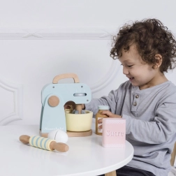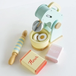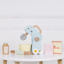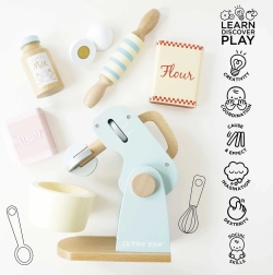 A stílusos Le Toy Van konyhai robot hiteles sütési élményt nyújt a gyerekeknek a játék konyhájukban. A forgó habverőnek, a fa nyújtófának és a tálnak köszönhetően „süthetnek” tortát, kekszet vagy piskótát. A pasztell színek és a retró design gyönyörködtet, míg a minőségi fa kivitel hosszú élettartamot biztosít.