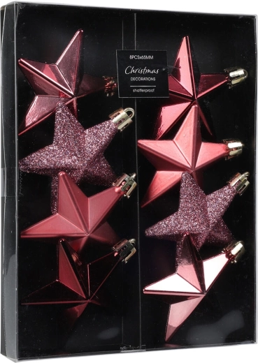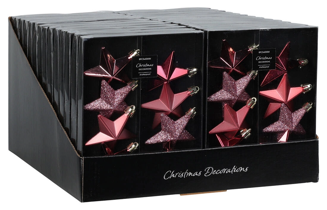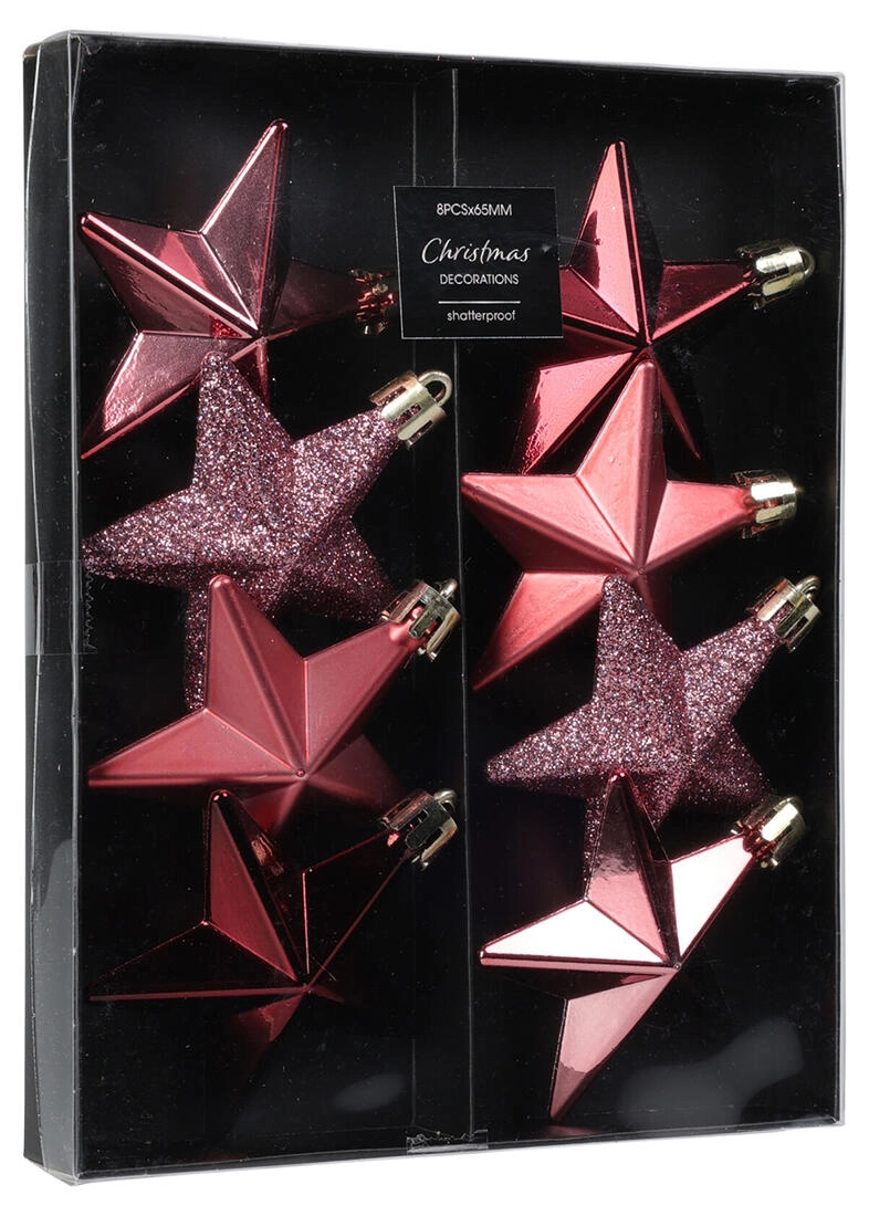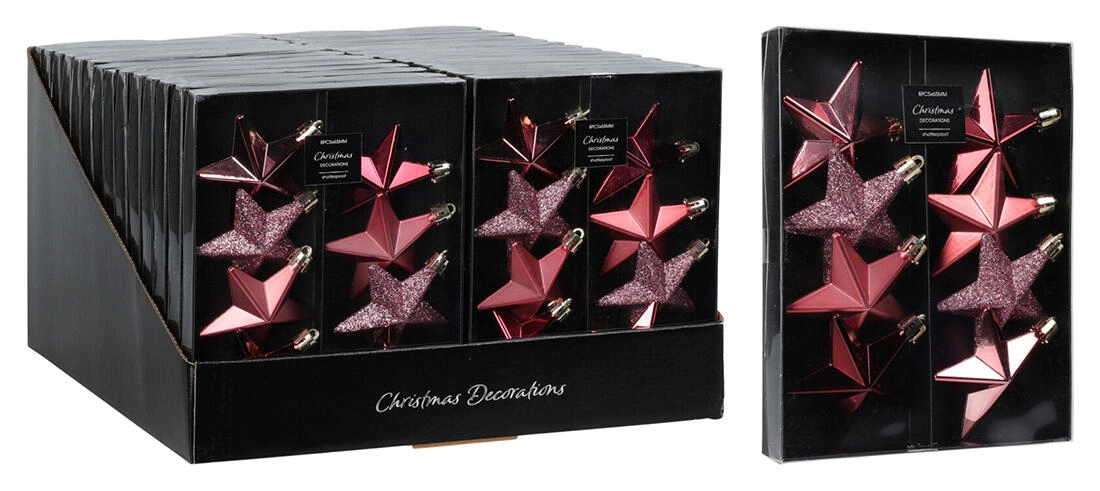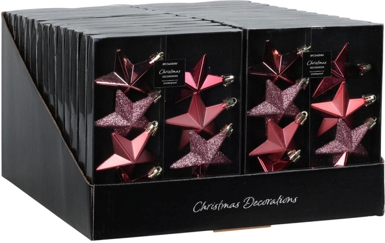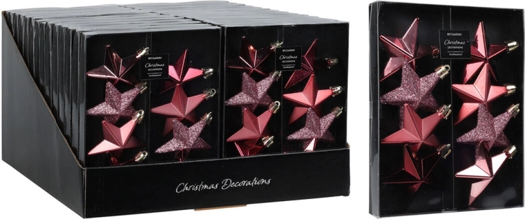 Elegáns karácsonyi szett függeszthető, csillag alakú díszeket tartalmaz 6,5 cm átmérővel, rózsaszín árnyalatokban. Tökéletes a karácsonyfára, koszorúkra és ünnepi dekorációkra, finom csillogást és ünnepi hangulatot ad az otthonnak.