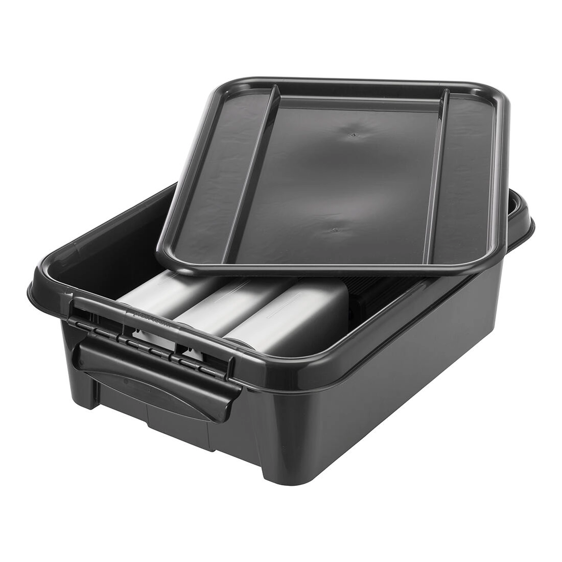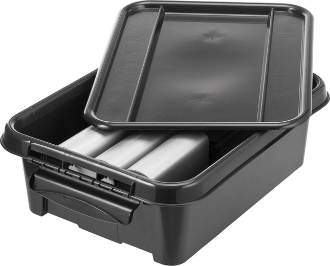 A fedeles, fekete, újrahasznosított PP doboz megbízható megoldás a mindennapi rendszerezéshez. Rendben tartja a kisebb és közepes tárgyakat, a masszív fedél és a klippek pedig biztonságosan zárnak, védve a portól.