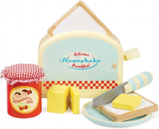 A LE TOY VAN Honeybake fa szettje meghitt kis konyhává varázsolja a gyereksarkot. A gyerekek imádni fogják a rugós kenyérpirítót, amelyből a kar lenyomása után két „pirítós” szelet ugrik ki. A tépőzáras vaj segít a helyes fogás és a késhasználat gyakorlásában, míg az eperlekváros üveg és a kis tányér teljessé teszi a játékos reggelit.