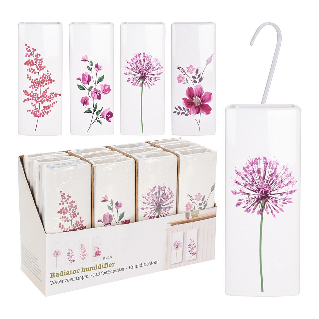 Elegáns kerámia radiátorpárásító tavaszi virágmotívummal, amely javítja otthona klímáját. Elég vízzel feltölteni és felakasztani – természetes levegőpárásítás áram nélkül, csendes működés és könnyű karbantartás. A fehér, fényes felület és a visszafogott virágdekor minden enteriőrbe illik.