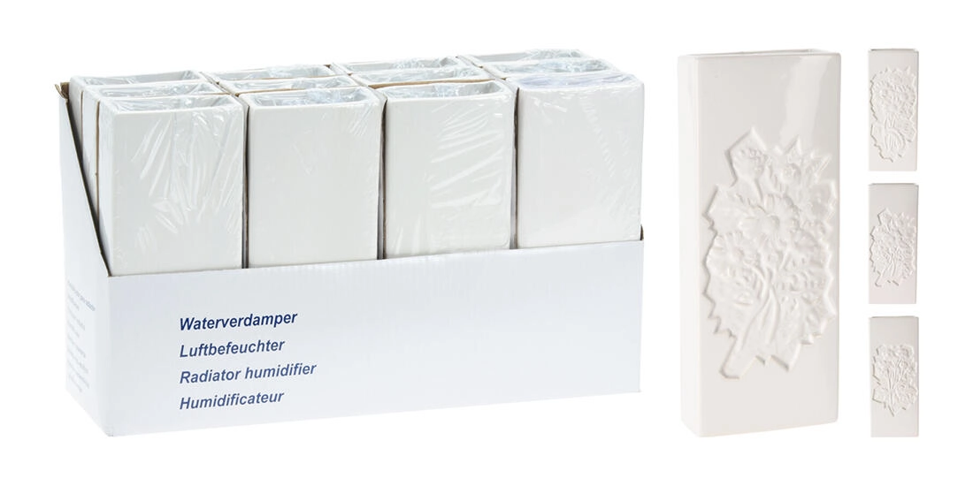 Elegáns kerámia radiátorpárologtató dombornyomott virágmintával, amely természetes módon párásítja a levegőt a száraz helyiségekben. A praktikus akasztónak köszönhetően könnyen felakasztható a legtöbb radiátorra. Kompakt méretei 20,5 × 8 × 3,5 cm helytakarékosak, a fehér szín pedig bármely enteriőrbe illik.