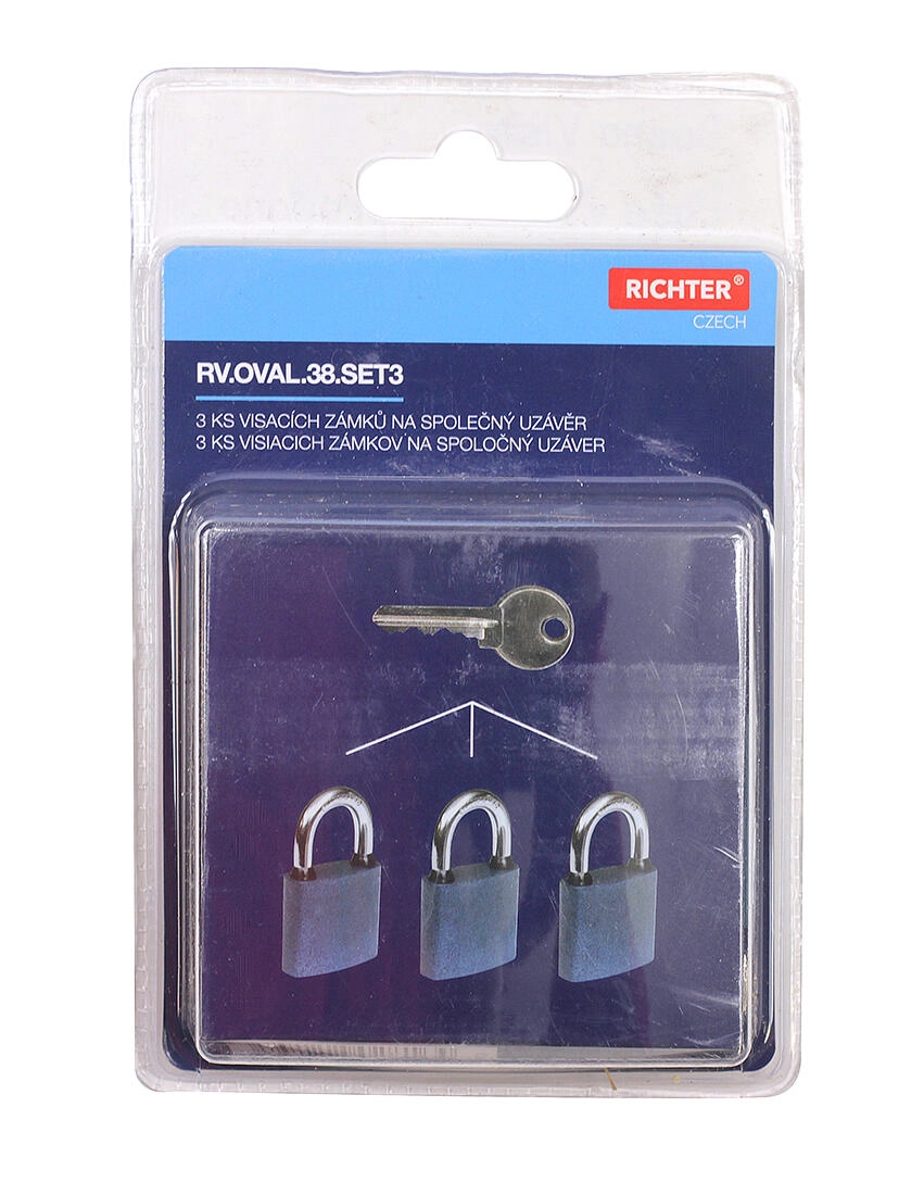 Praktikus, 3 darabos OVAL 38 lakatkészlet azonos zárlattal (SU), így mindegyik lakat egyetlen kulccsal nyitható. Tartós öntöttvas ház, megerősített, két ponton reteszelt HARDENED kengyel és gumigyűrűk a víz bejutása ellen a hosszú élettartamért. Önzáró funkció a kengyel benyomásával és 5 csapos zárbetét a magasabb biztonságért.