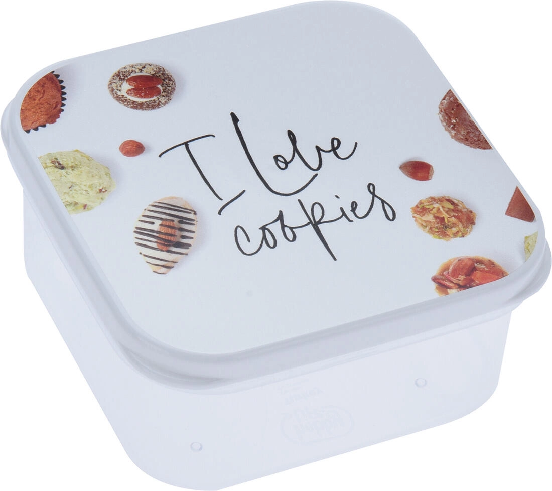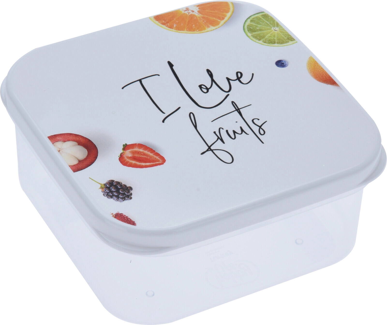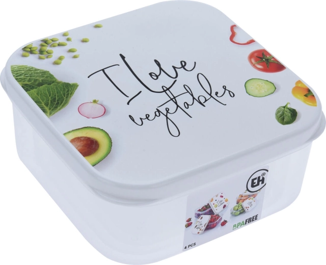 Stílusos négy darabos, négyzet alakú doboz szett fedőkkel a mindennapi élelmiszer-tároláshoz. A szorosan záródó fedőknek, a praktikus méreteknek és a stócolható formának köszönhetően minden friss és átlátható marad. A dobozok BPA-mentes műanyagból készültek, játékos mintákkal: gyümölcs, zöldség, makaron és süti.