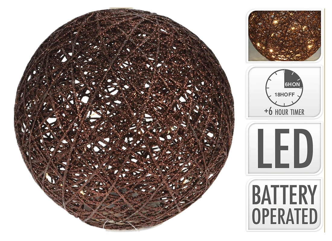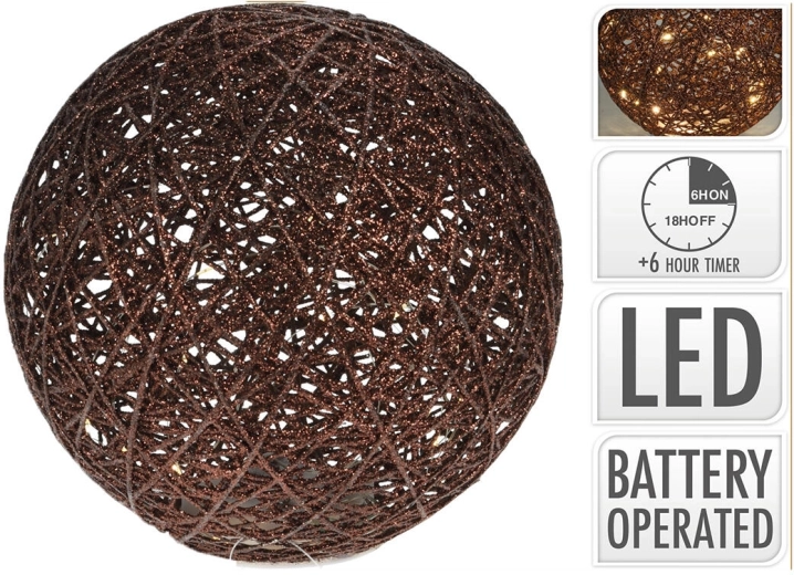 Világító fém gömb 20 cm időzítővel, barna, 20 LED