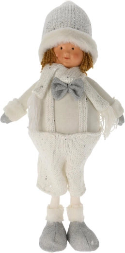 Ez az álló figura téli szettben a gyerekeknek és a felnőtteknek egyaránt örömet szerez. Remekül illik a modern enteriőrökhöz, és finom részleteinek – a kötött, pomponos sapkának, a sálnak és a puha csizmácskáknak – köszönhetően meghitt, ünnepi hatást kelt. Könnyű, mégis stabil dekoráció, amelyet bármilyen sík felületre egyszerűen elhelyezhet.