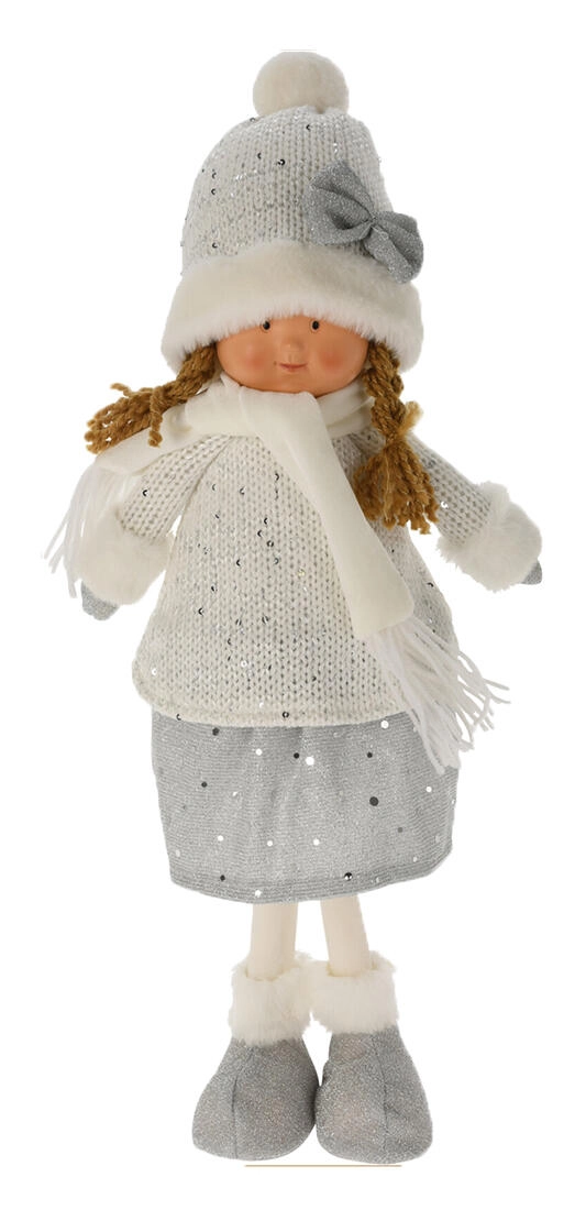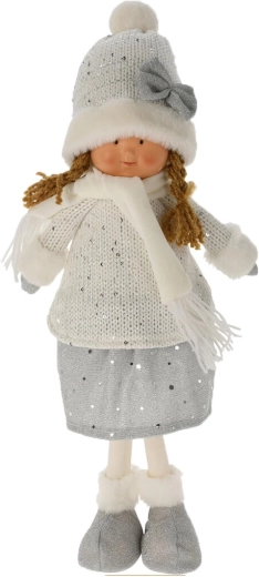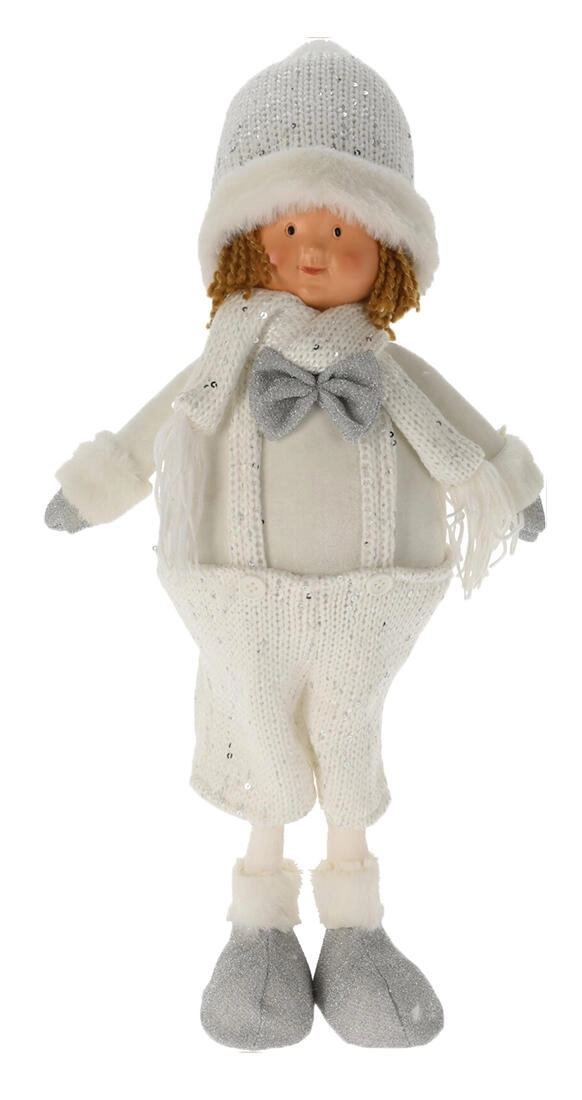 Bájos téli dekoráció, 49 cm magas álló figura elegáns fehér-ezüst kivitelben. Puha plüssből és részletgazdagon kidolgozott poliszton arcrésszel, amely varázslatos téli hangulatot teremt otthon és a nyaralóban egyaránt. Ideális komódra, polcra vagy karácsonyi asztaldísznek.