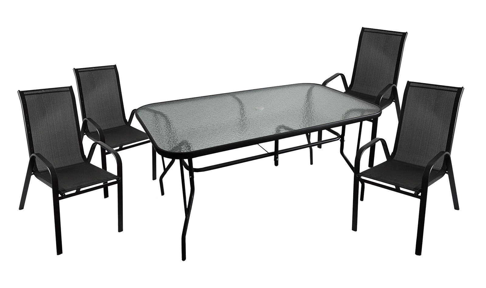Kerti étkezőgarnitúra edzett üveg asztallappal és 4 székkel, acél és textilén, fekete