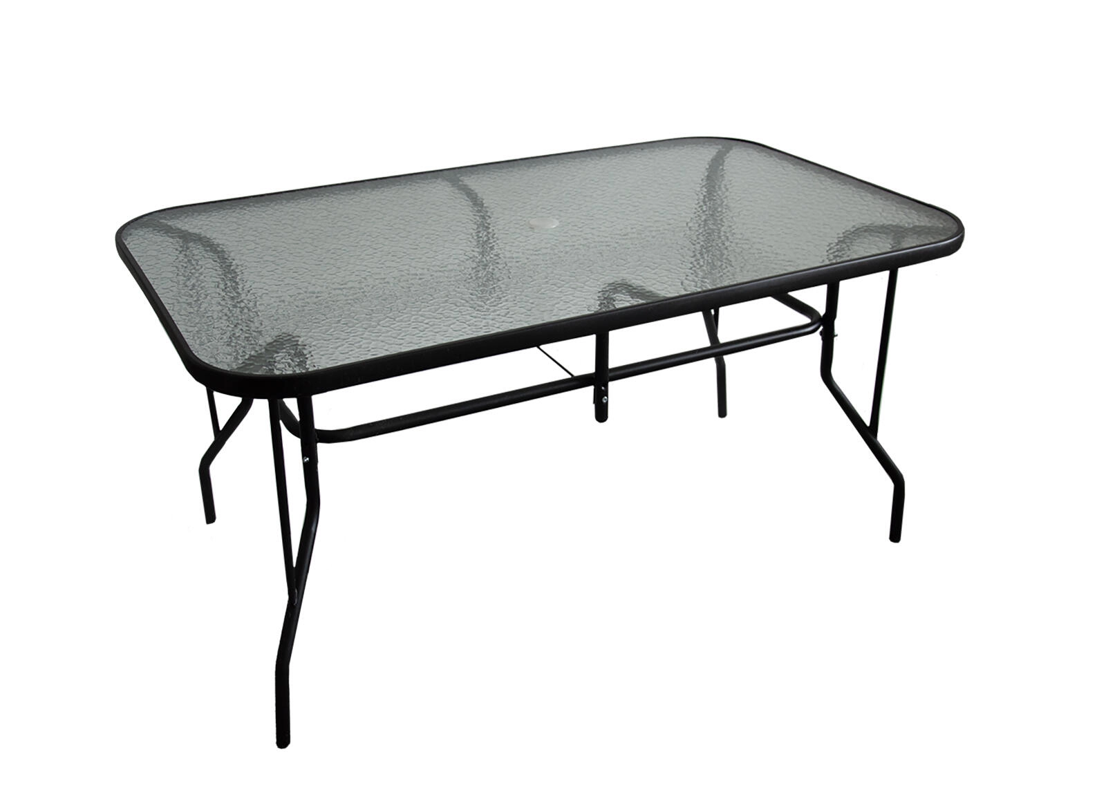 A 150 × 90 cm-es téglalap alakú, 5 mm vastag edzett üveglap dekoratív struktúrával tartós, stabil és könnyen tisztítható – ideális családi ebédekhez és grillpartikhoz.
