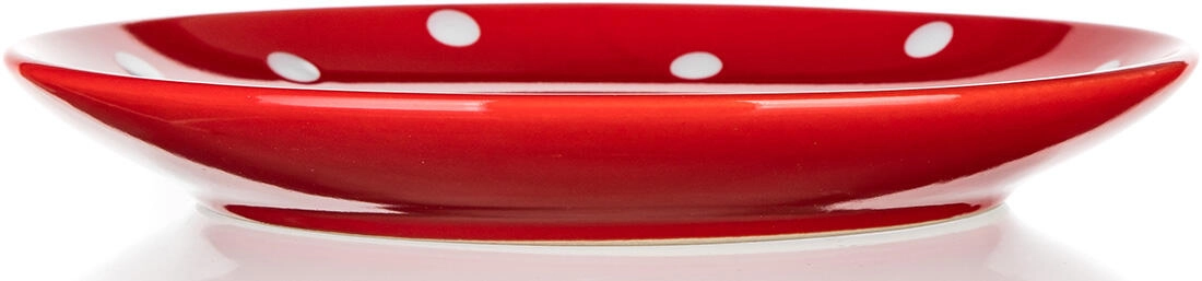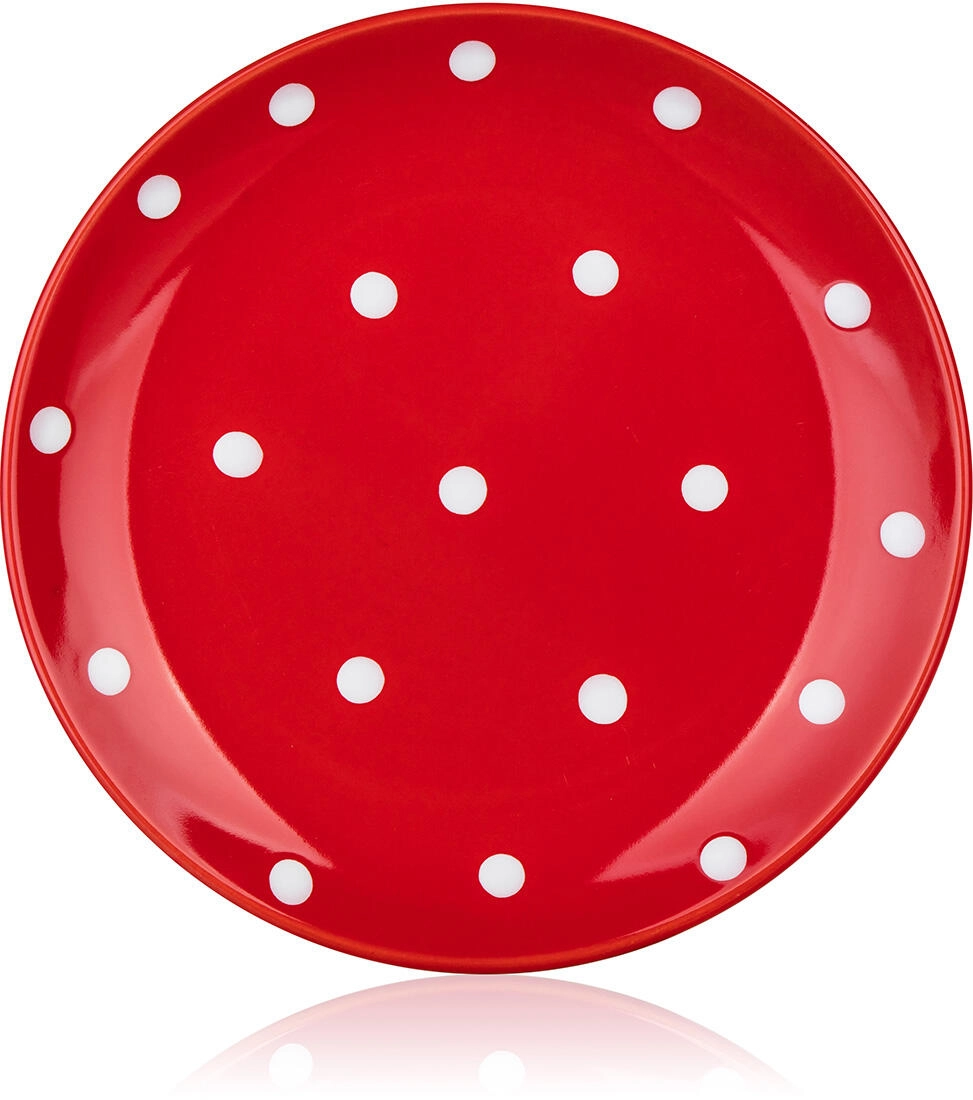 A piros alapon fehér pöttyök egyedi megjelenést kölcsönöznek az asztalnak, és remekül kombinálhatók semleges vagy színes edényekkel.