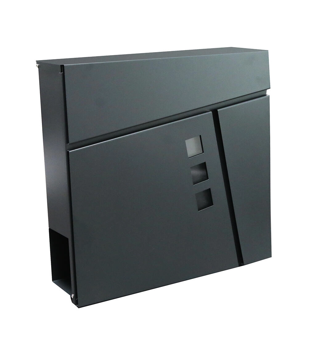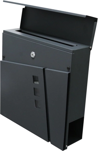 Modern TILES levélszekrény elegáns antracit színben a küldemények biztonságos átvételéhez. Kínál felülről történő bedobónyílást, hengerzárat 2 kulccsal és egyszerű szerelést csavarokkal és tiplikkel együtt. Az alsó részen praktikus újság- és szórólaptartó tubus található.