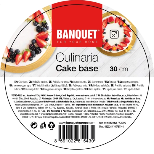 Ez a minőségi, kétoldalas arany tortaalátét megbízható alap minden ünnepi desszerthez. A 3 mm vastag, többrétegű kartonszerkezet magas szilárdságot és stabilitást biztosít, míg a mindkét oldali arany laminálás nedvesség- és zsírállóságot garantál.