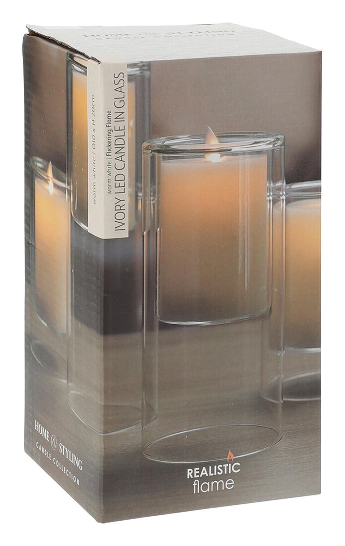 Ez a stílusos LED gyertya 10 cm átmérővel és 20 cm magassággal masszív üvegborításban kapott helyet, amely kiemeli elegáns megjelenését. A finom ivory árnyalat univerzális hatású, és könnyen illeszthető bármely enteriőrhöz.