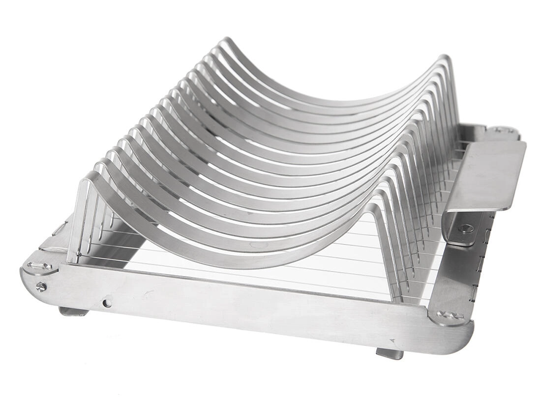 Könnyítse meg a házi knédli tálalását. Ez a rozsdamentes szeletelő párhuzamos húrokkal egyenlő vastagságú szeleteket biztosít gyűrődés nélkül, és nem sérti a frissen főtt tészta szerkezetét. Ideális kelt és burgonyás knédlihez.