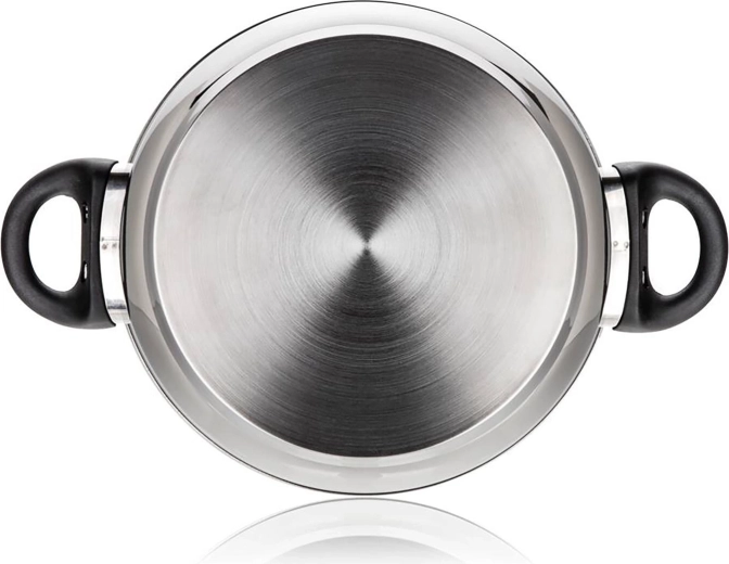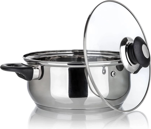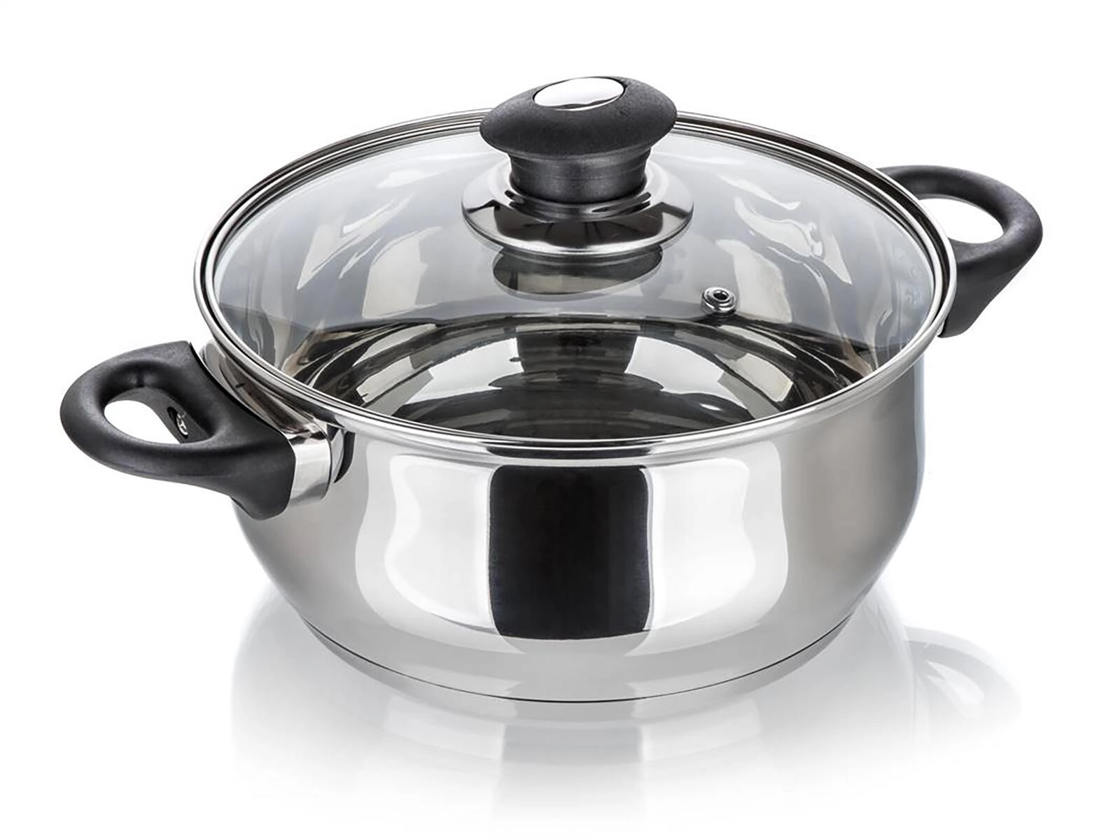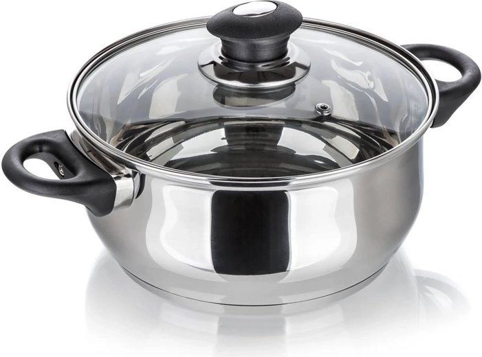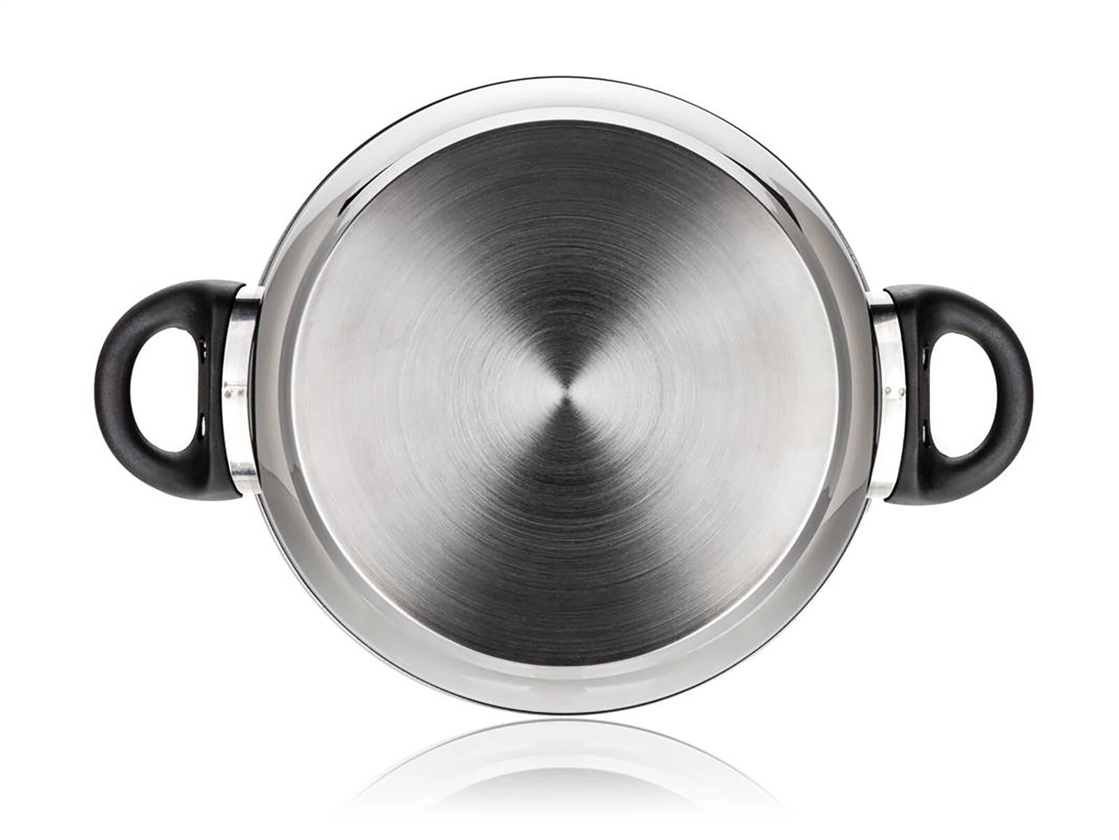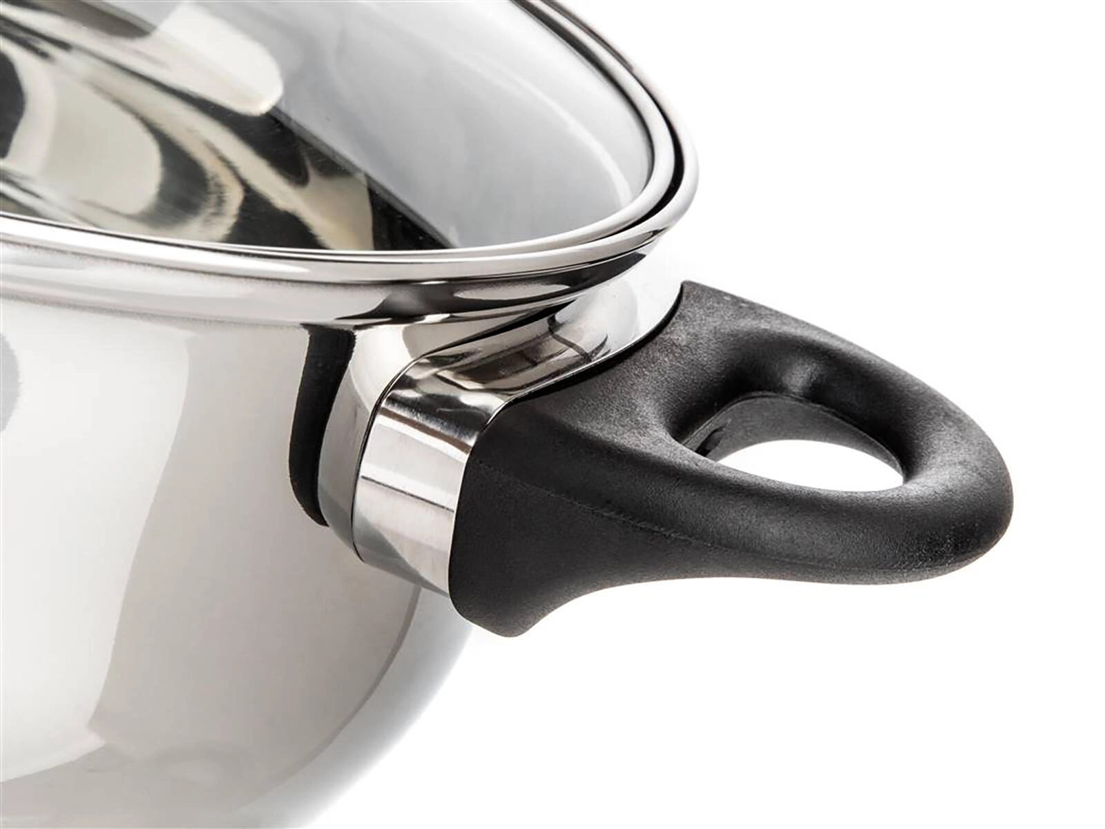 A Super Value rozsdamentes fazék az univerzális felhasználást megbízható teljesítménnyel ötvözi. Az üvegfedőnek köszönhetően a főzés teljes mértékben ellenőrizhető, míg a masszív, fényes felületű rozsdamentes test elegáns megjelenést kölcsönöz konyhájának. Az ergonomikus bakelit fogantyúk és a gomb biztonságos, kényelmes fogást garantálnak még magasabb hőmérsékleten is.