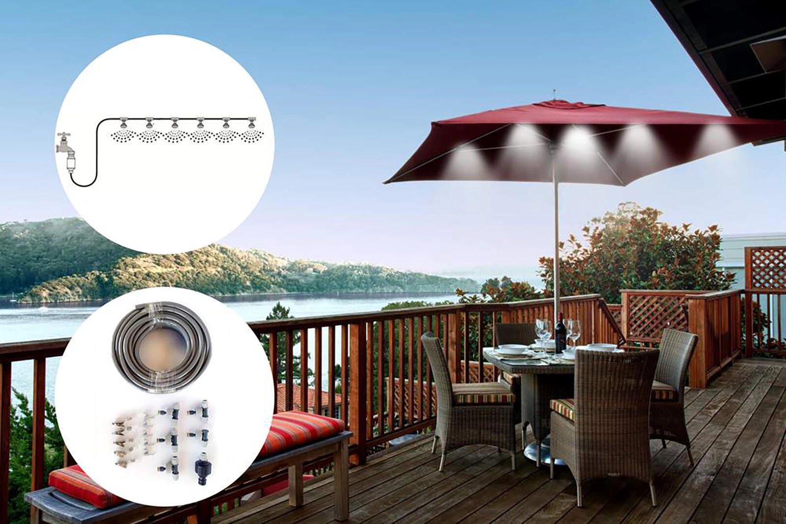 A vízpermet-készlet gyors hűtést biztosít a kültéri területeken forró napokon. A 7,5 m hosszú, rugalmas tömlőnek köszönhetően a 5 mikrofúvókát pontosan oda helyezheti, ahol szüksége van rá – a pergolára, erkélyre, teraszra vagy a napernyő köré. A vízcsatlakozáshoz történő csatlakoztatás pillanatok kérdése, a fúvókák szórásszöge pedig beállítható a maximális kényelemért, elkerülve a nem kívánt eláztatást.
