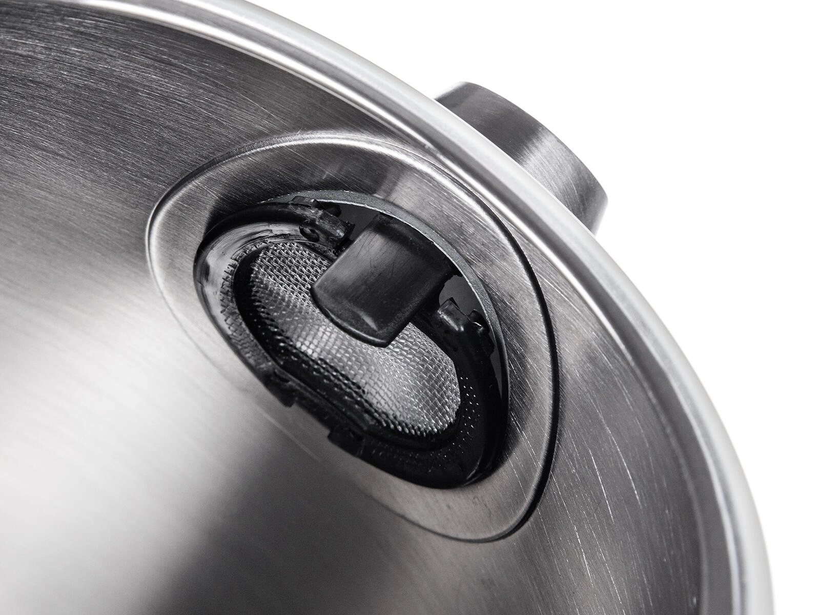 A biztonságos és kényelmes használatért túlmelegedés elleni védelemmel, automatikus és manuális kikapcsolással, valamint 360°-ban forgatható talppal rendelkezik központi csatlakozóval. A praktikus beépített szűrő felfogja a durva szennyeződéseket, a rozsdamentes kivitel pedig megkönnyíti a tisztítást és növeli az élettartamot.