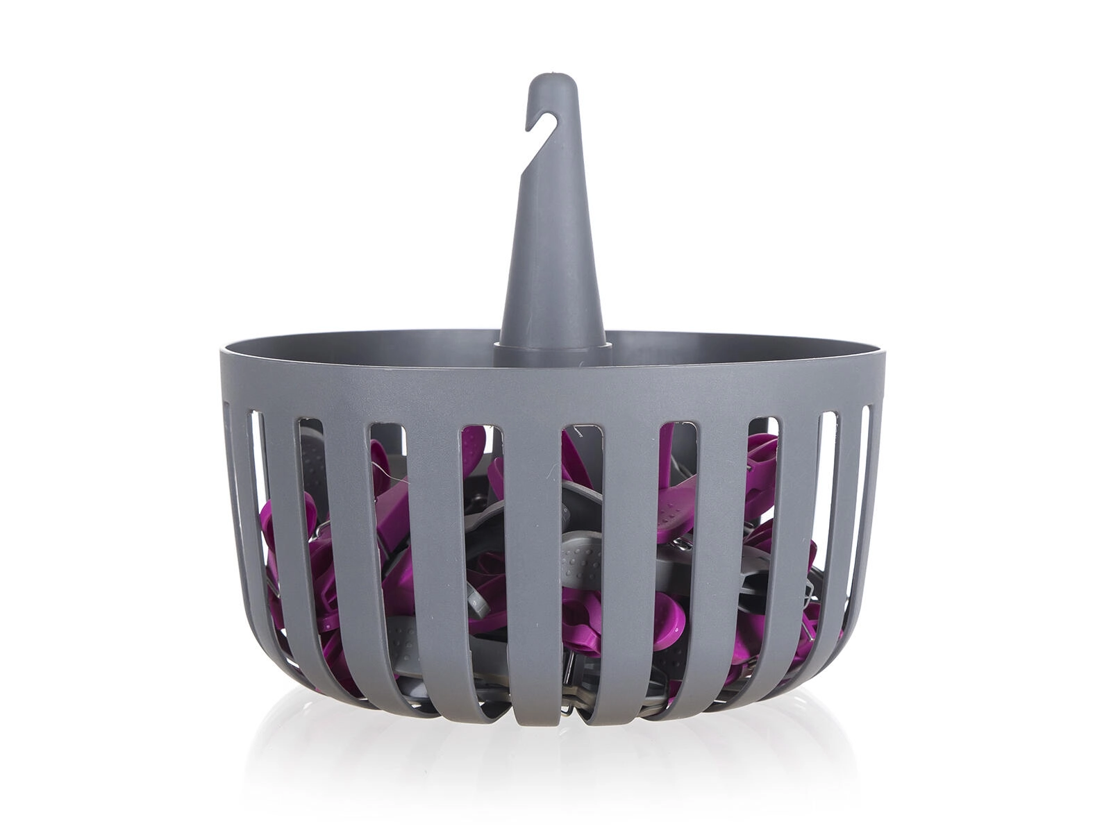 Praktikus szett a mindennapi ruhaszárításhoz: akasztós kosár kampóval és 30 tartós műanyag ruhacsipesszel lila és antracit színű vegyes összeállításban. A kosár közvetlenül a szárítókötélre akasztható, így a csipeszek mindig kéznél vannak, a szárítás pedig gyorsabb és kényelmesebb.