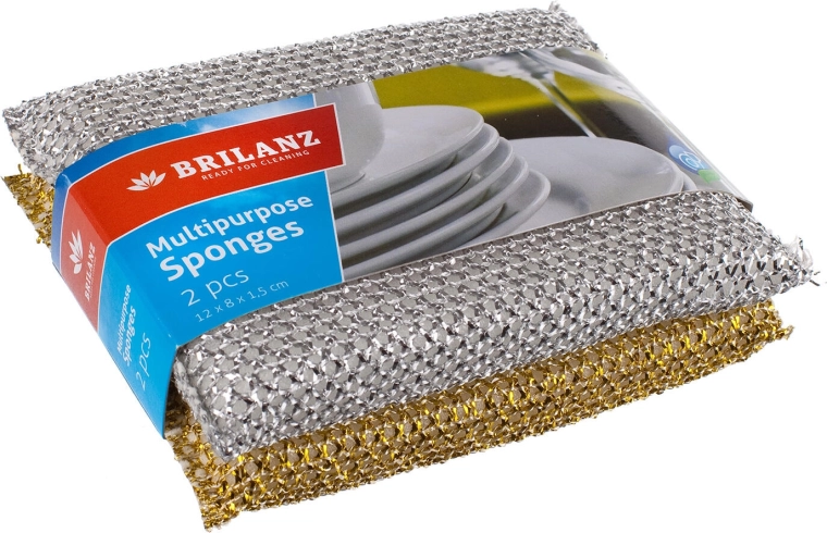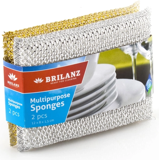 Két darab BRILANZ többcélú szivacs praktikus szettje a mindennapi takarításhoz. A 12 × 8 cm-es méretnek köszönhetően jól kézbe illik, és hatékonyan eltávolítja a szennyeződéseket. Az arany és ezüst színmixű felület ideális az alapos tisztításhoz edényeken és a háztartásban is, míg az erős szerkezet hosszú élettartamot biztosít.