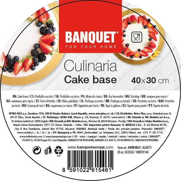 A praktikus, 40 × 30 × 0,3 cm méretű tortaalátét több réteg erős kartonból készül, mindkét oldalán arany fóliával bevonva a vízállóság és a zsírmentes átázás elleni védelem érdekében. Kiválóan használható munkatálcaként díszítéshez és a torta biztonságos szállításához is.