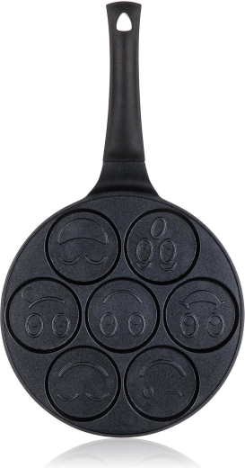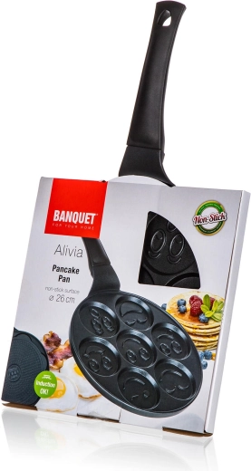 Fedezze fel a játékos ALIVIA Smile palacsintasütőt 26 cm átmérővel és hét darab, 8 cm-es formával. A tapadásmentes felületnek köszönhetően palacsintát, tükörtojást és tócsnit készíthet leégés nélkül. A serpenyő minden típusú tűzhelyhez, beleértve az indukciósat is, alkalmas, és vidám gyerek motívumokkal teszi szórakoztatóvá minden adagot.