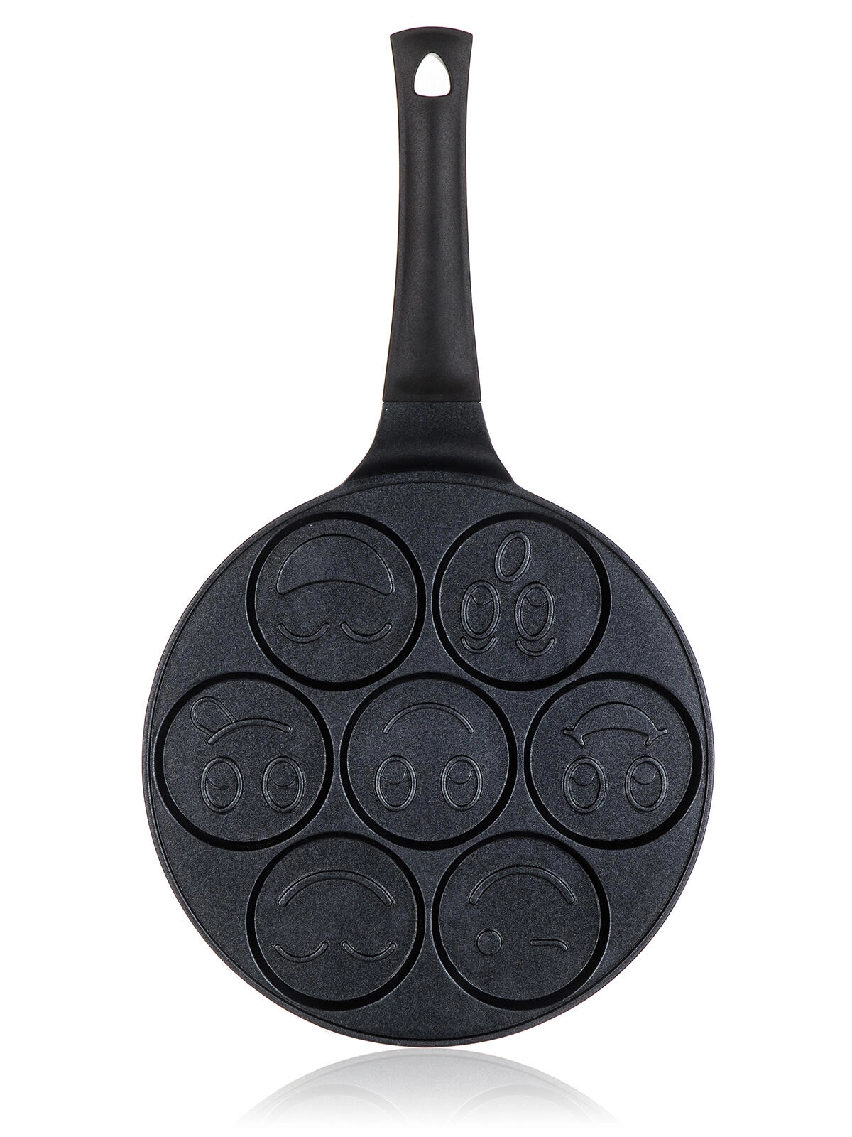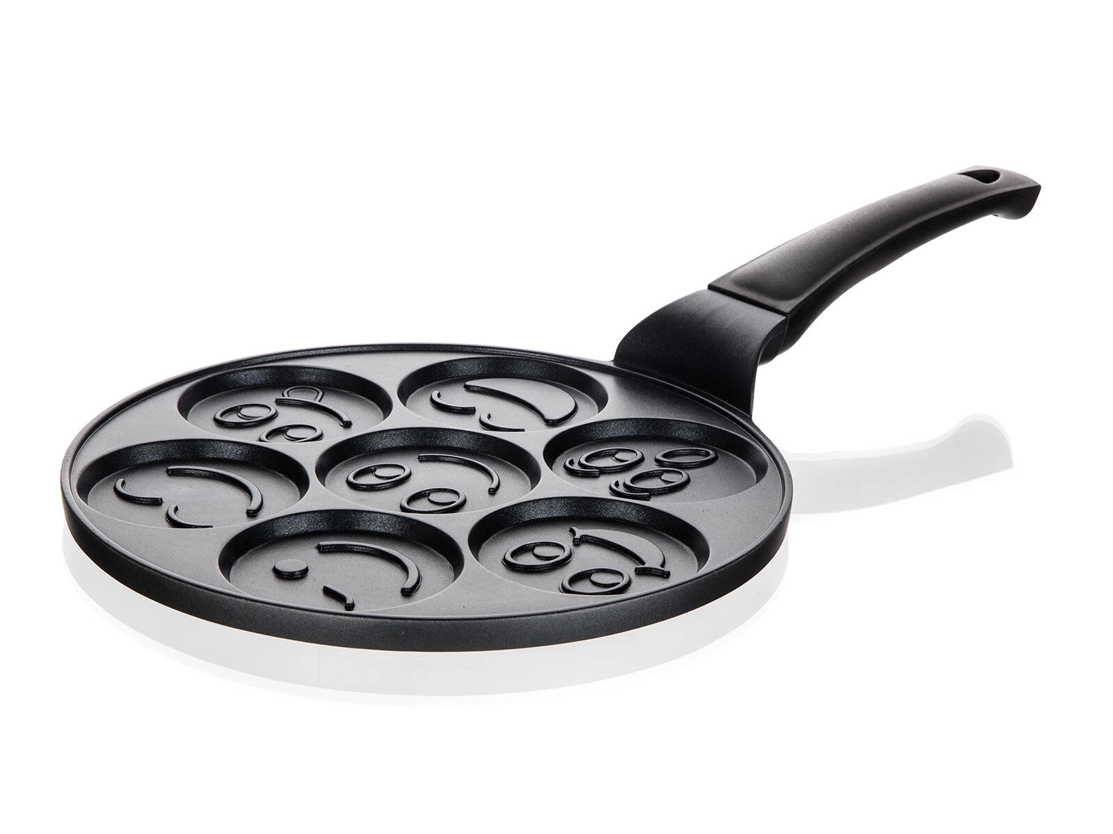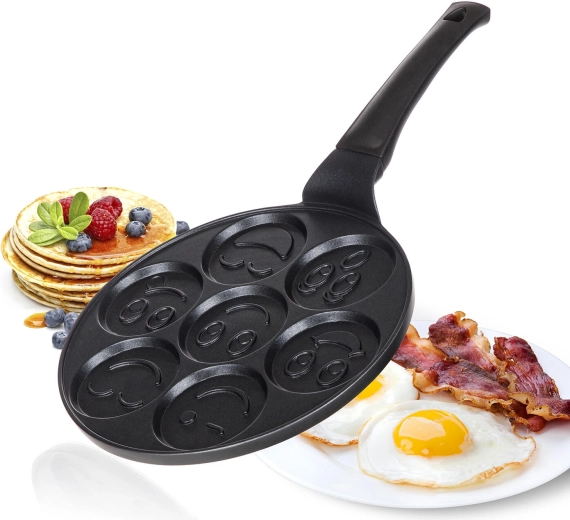 Az ALIVIA Smile palacsintasütő minden reggelit szórakozássá varázsol. Hét kör alakú, 8 cm átmérőjű mélyedés domborított motívumokkal gondoskodik a tökéletes formájú palacsintákról és mosolygós tojásokról. Az öntött alumínium gyors és egyenletes felmelegedést biztosít, míg a minőségi tapadásmentes felület megkönnyíti a forgatást és a tisztítást.