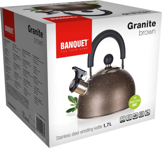 Elegáns, 1,7 l űrtartalmú rozsdamentes acél teáskanna GRANITE Brown dizájnnal, ideális a mindennapi használathoz. Kínál univerzális használatot minden főzőfelületen, beleértve az indukciósat is, praktikus forralásjelzést a beépített sípnak köszönhetően, valamint strapabíró rozsdamentes acél kialakítást kényelmes, lehajtható műanyag fogantyúval.