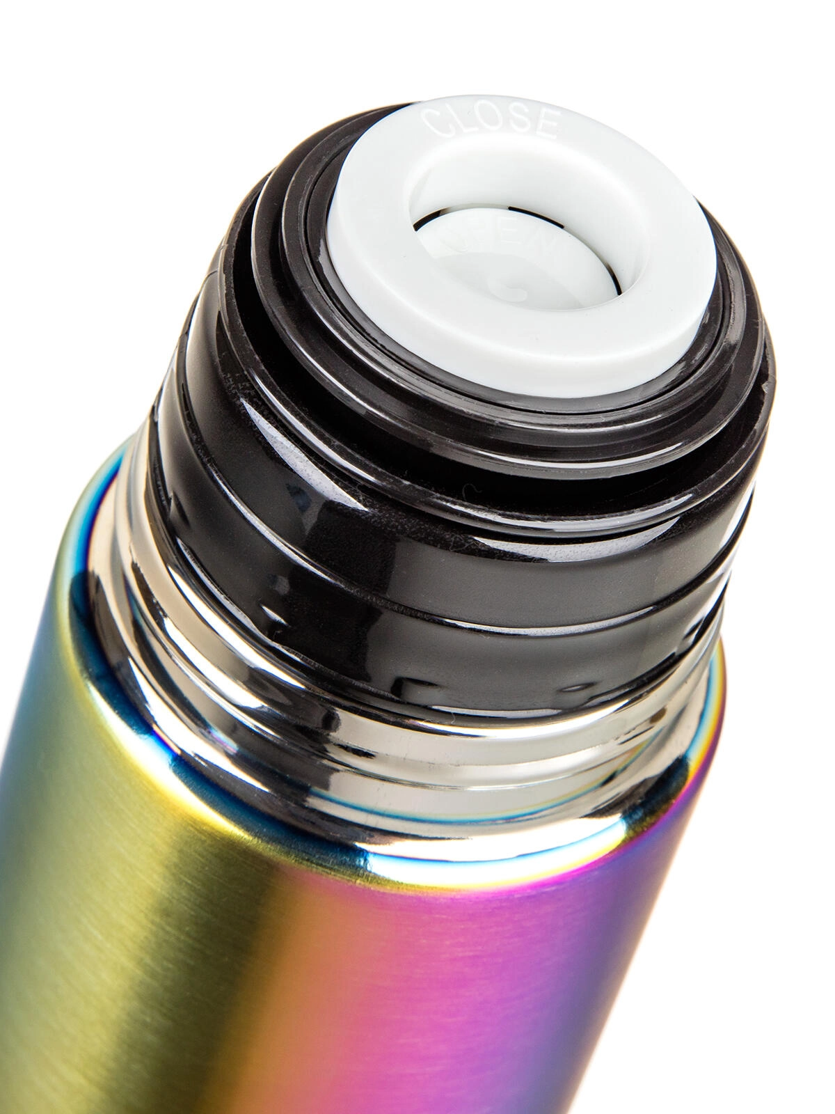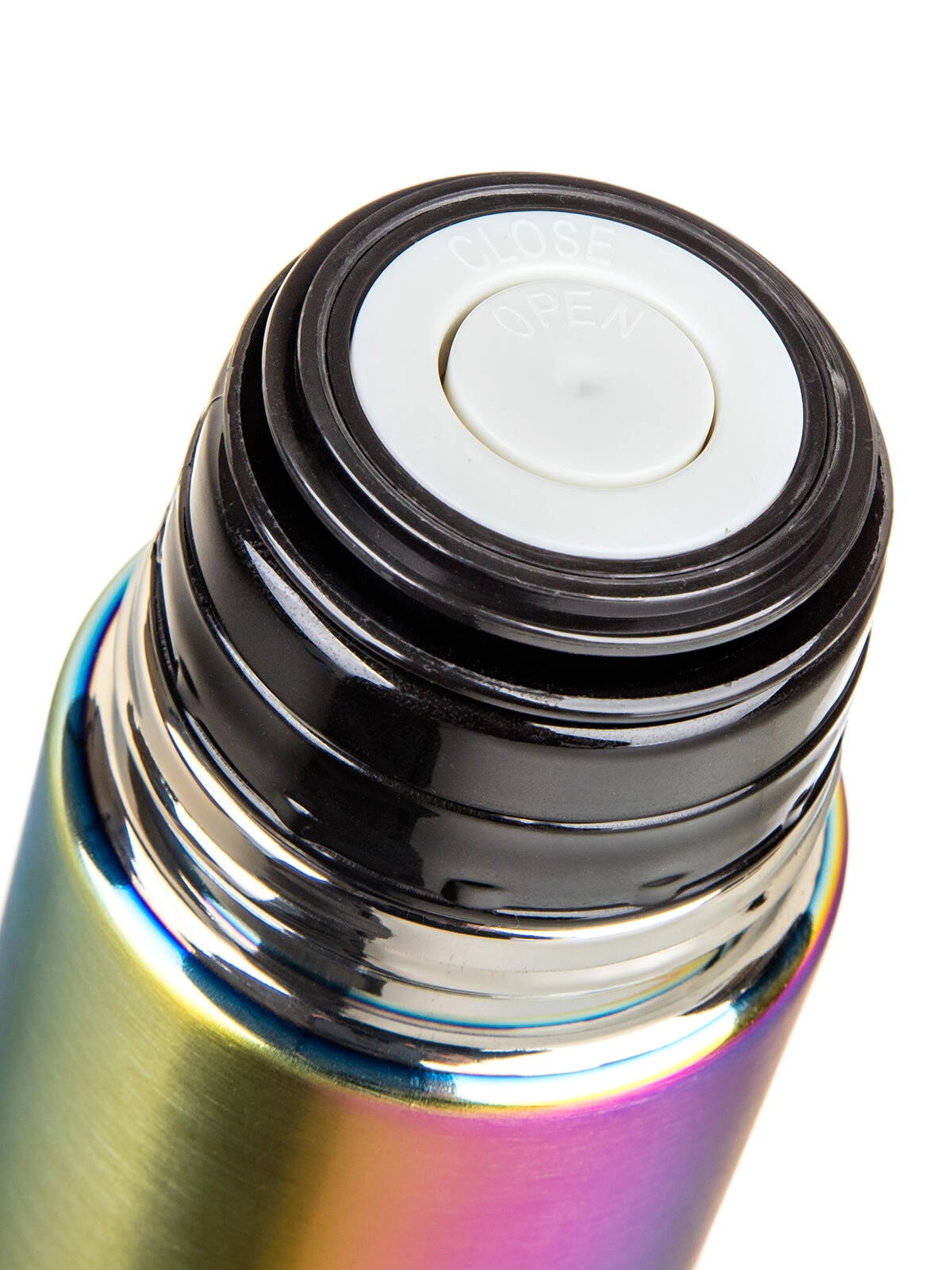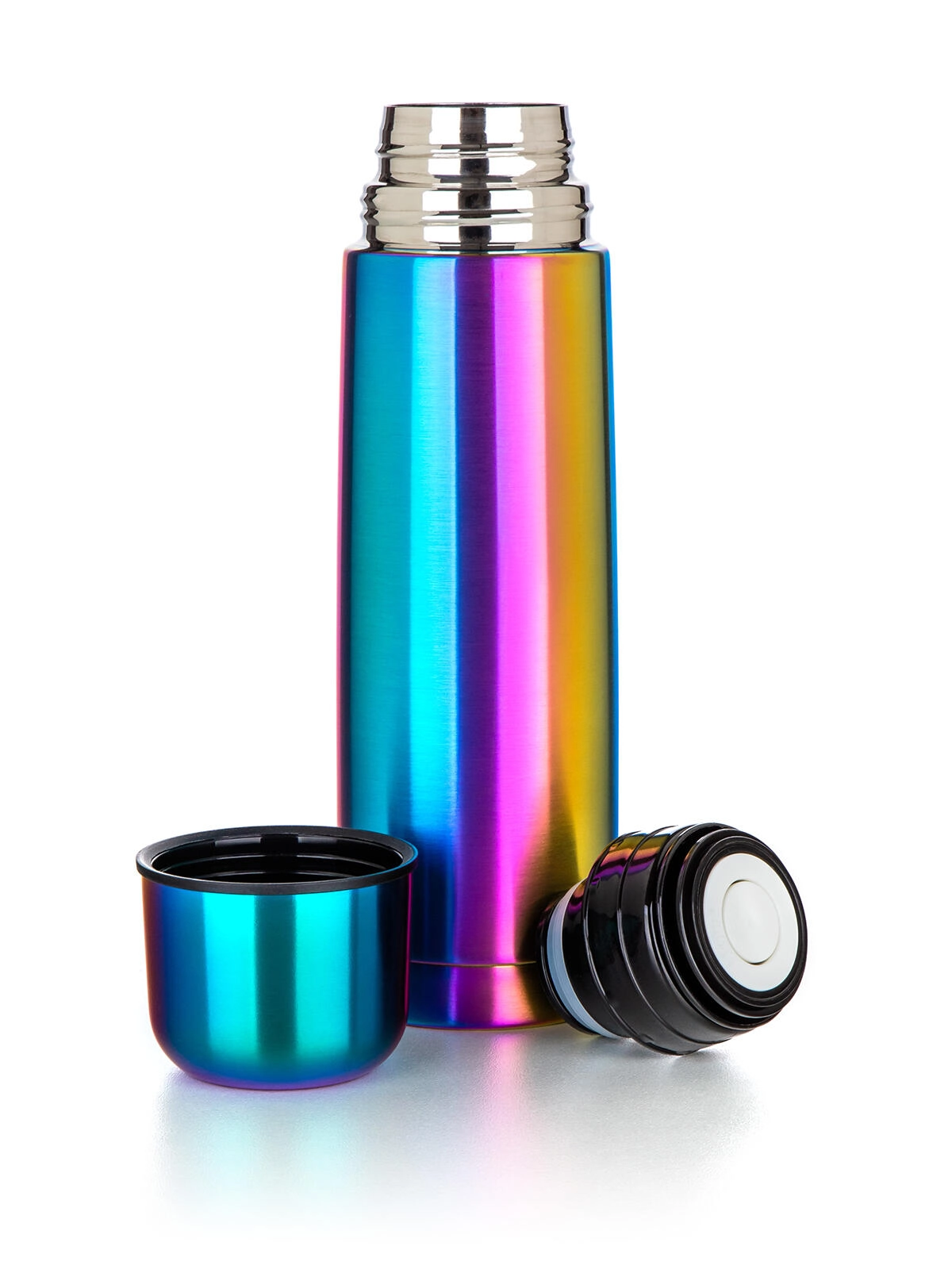 A praktikus klippes műanyag kupak lehetővé teszi az egyérintéses kiöntést – egy nyomás nyit, a következő zár. A tető pohárként szolgál, így külön bögrére nincs szükség. Az eleganciát a szivárványos matt felület teszi teljessé, amely első pillantásra megragadja a tekintetet, és ellenáll a mindennapi igénybevételnek.
