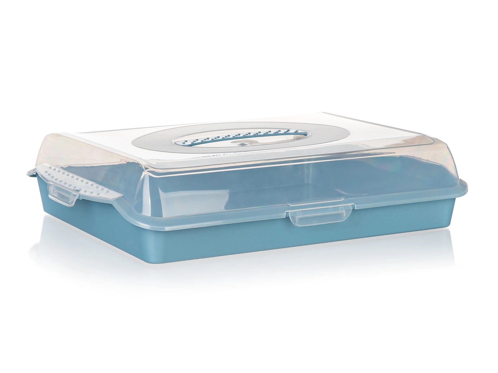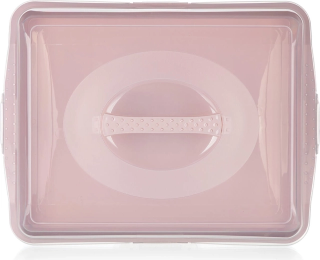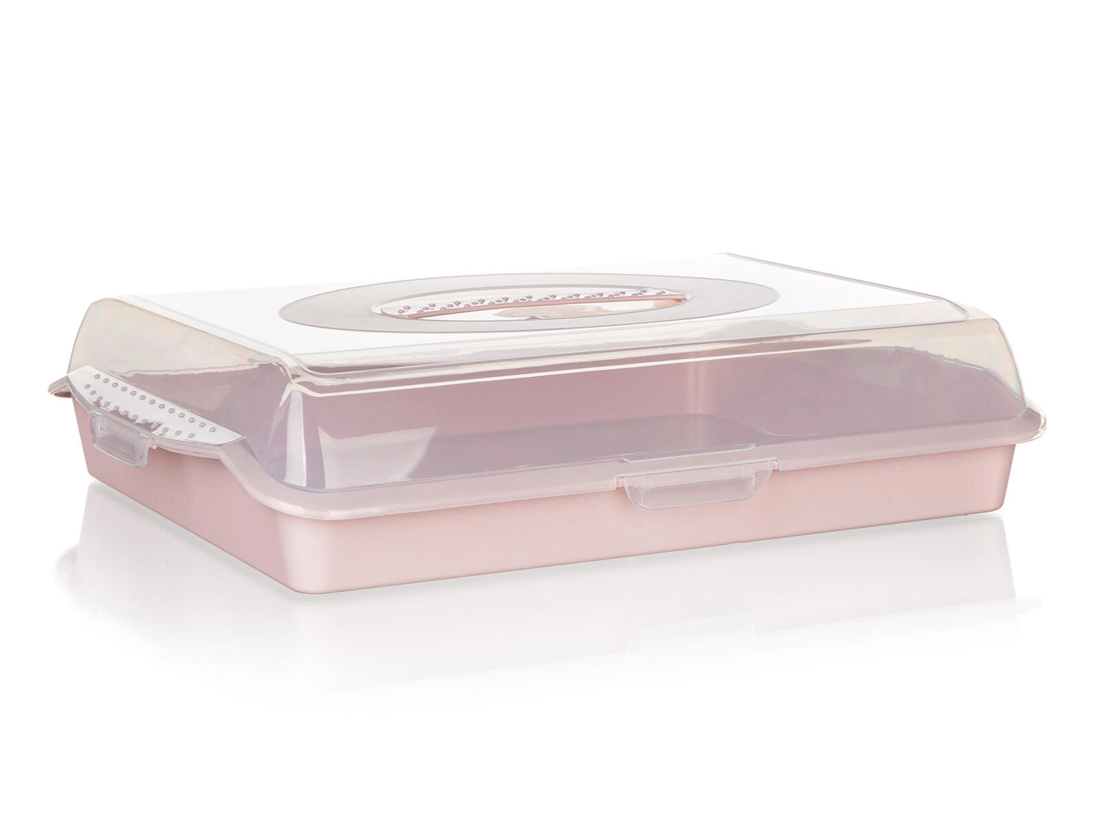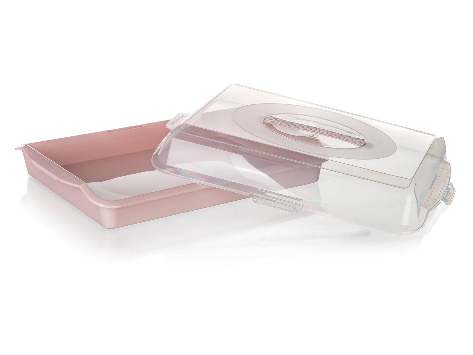 Praktikus műanyag fedeles tálca Culinaria, 45 × 35 × 10,5 cm méretben, ideális pitek, torták és sütemények szállításához és tárolásához. Az átlátszó fedél biztonságos klipszekkel védi a tartalmat a portól és a sérülésektől, míg az alacsony profil kényelmes rakást tesz lehetővé. Elérhető színmixben – rózsaszín és kék.