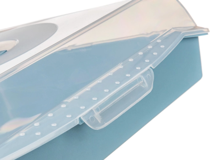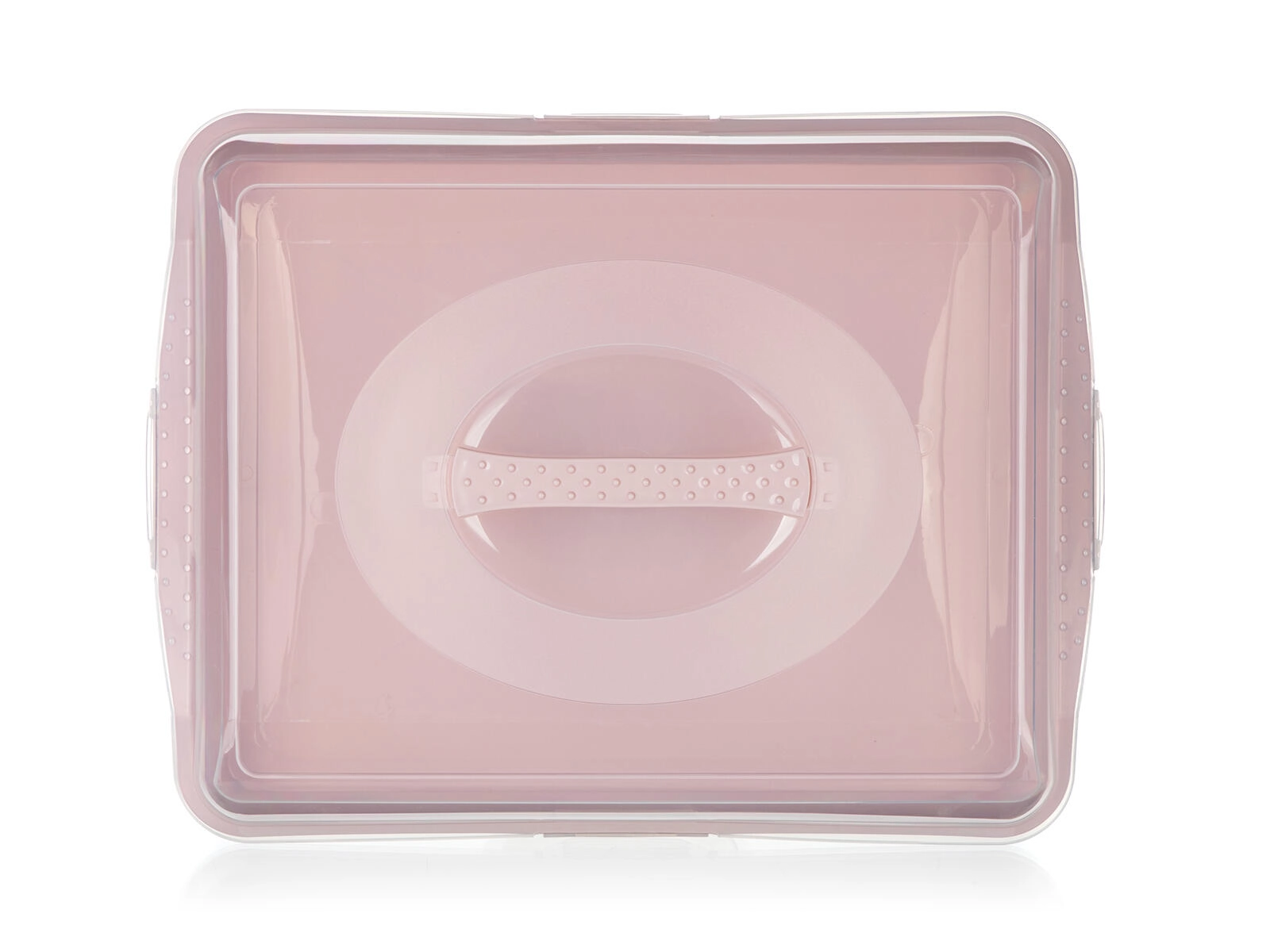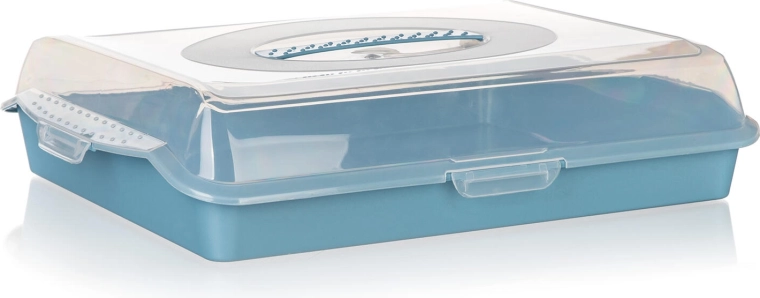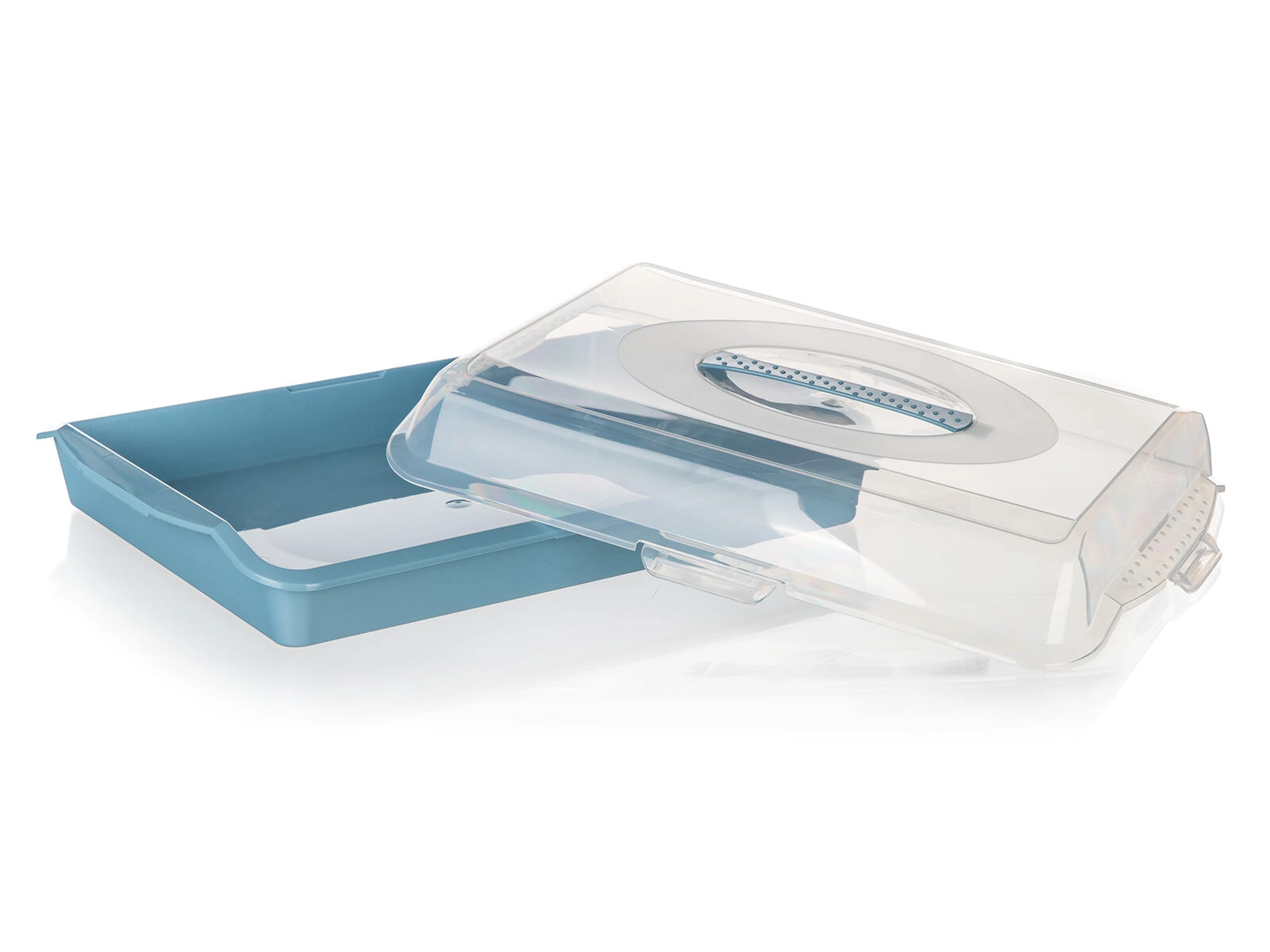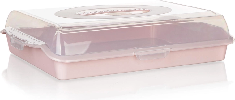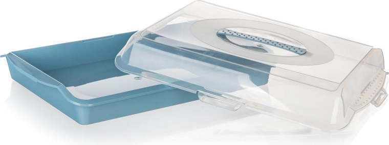 Praktikus műanyag fedeles tálca Culinaria, 45 × 35 × 10,5 cm méretben, ideális pitek, torták és sütemények szállításához és tárolásához. Az átlátszó fedél biztonságos klipszekkel védi a tartalmat a portól és a sérülésektől, míg az alacsony profil kényelmes rakást tesz lehetővé. Elérhető színmixben – rózsaszín és kék.