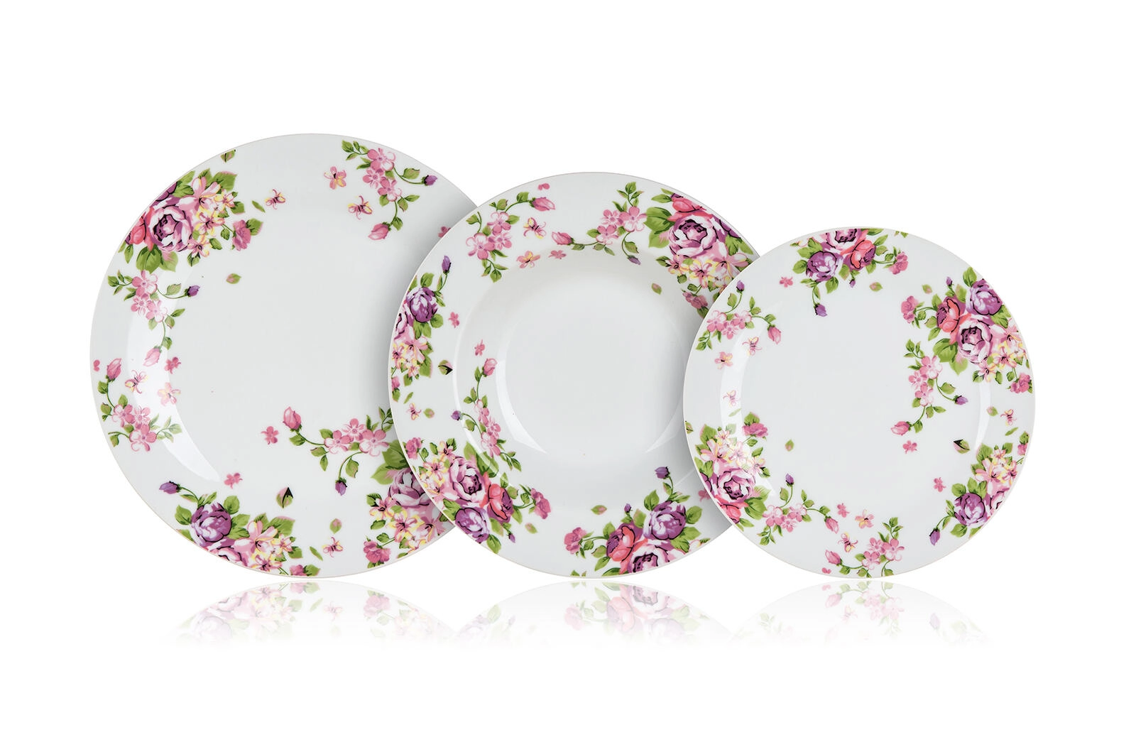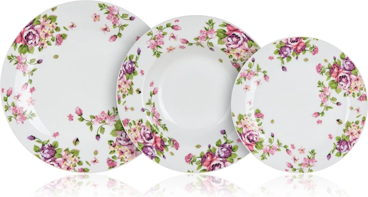 A készlet 6 személyre készült, és háromféle tányért tartalmaz a teljes szervírozáshoz: előételekhez, levesekhez, főételekhez és desszertekhez. A strapabíró porcelán megkönnyíti a tisztítást – a tányérok mosogatógépben moshatók és mikrohullámú sütőben használhatók.