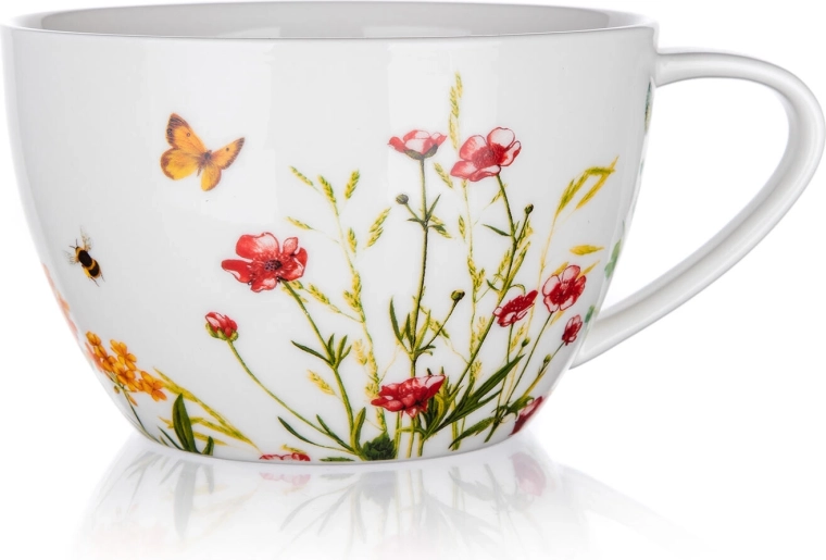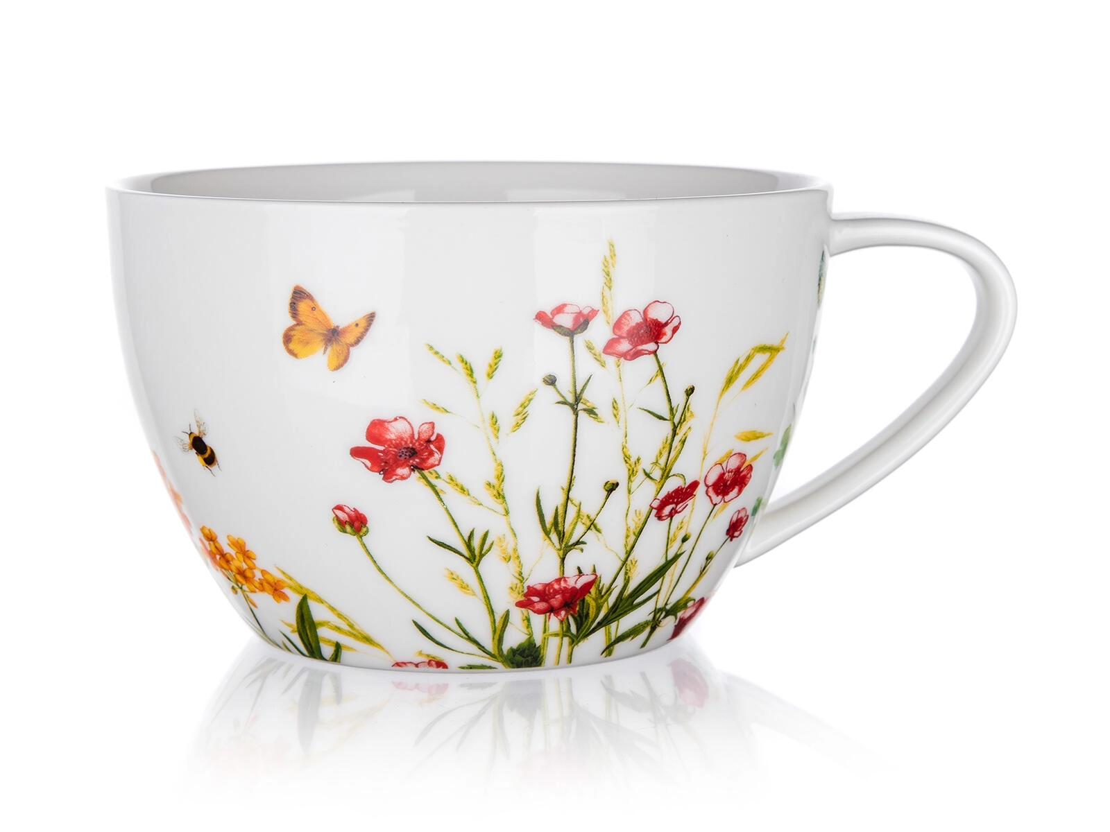 A nagy Jumbo Meadow kerámia bögre (550 ml) ideális a mindennapi pihenéshez. A természetes, virágos minta pillangóval és méhecskével egyedi bájt kölcsönöz a tálalásnak, és könnyen kombinálható a hasonló dekorú darabokkal.